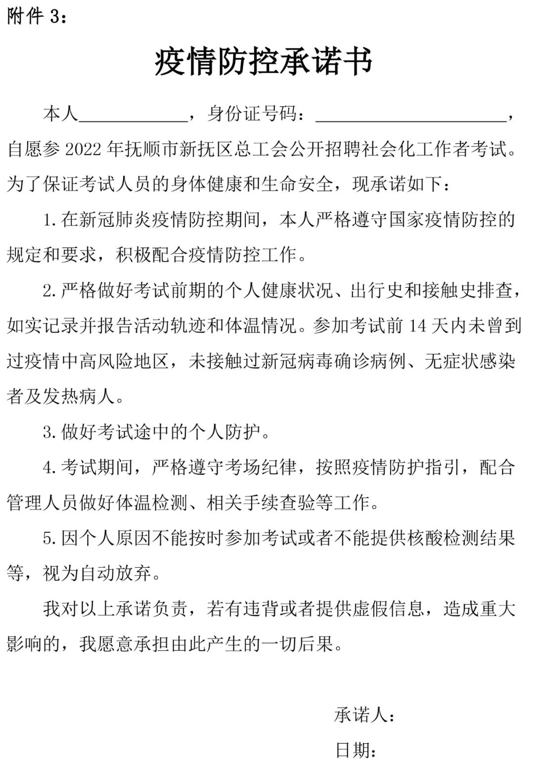 2、本次考试不指定考试辅导用书,不举办和委托任何机构进行考试辅导;招考工作由抚顺市维新劳务派遣有限公司在抚顺市新抚区总工会的监督下根据公开招考流程统一组织,不收取任何费用及押金,所有带有收费性质的招考信息均为虚假信息。请考生不要相信任何中介,若因此造成损失责任自负。
