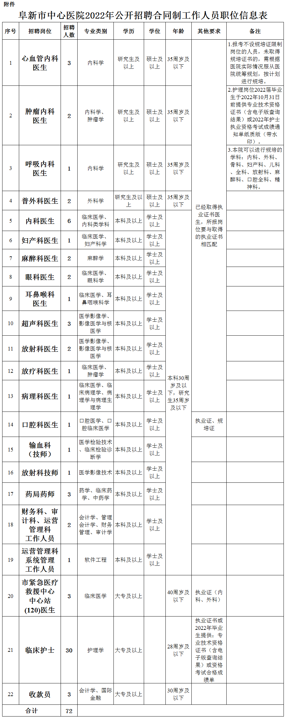 拟招聘合同制工作人员72名,具体招聘岗位、资格条件及有关事项详见附件1《阜新市中心医院2022年公开招聘合同制工作人员职位信息表》(见文中最下方)。