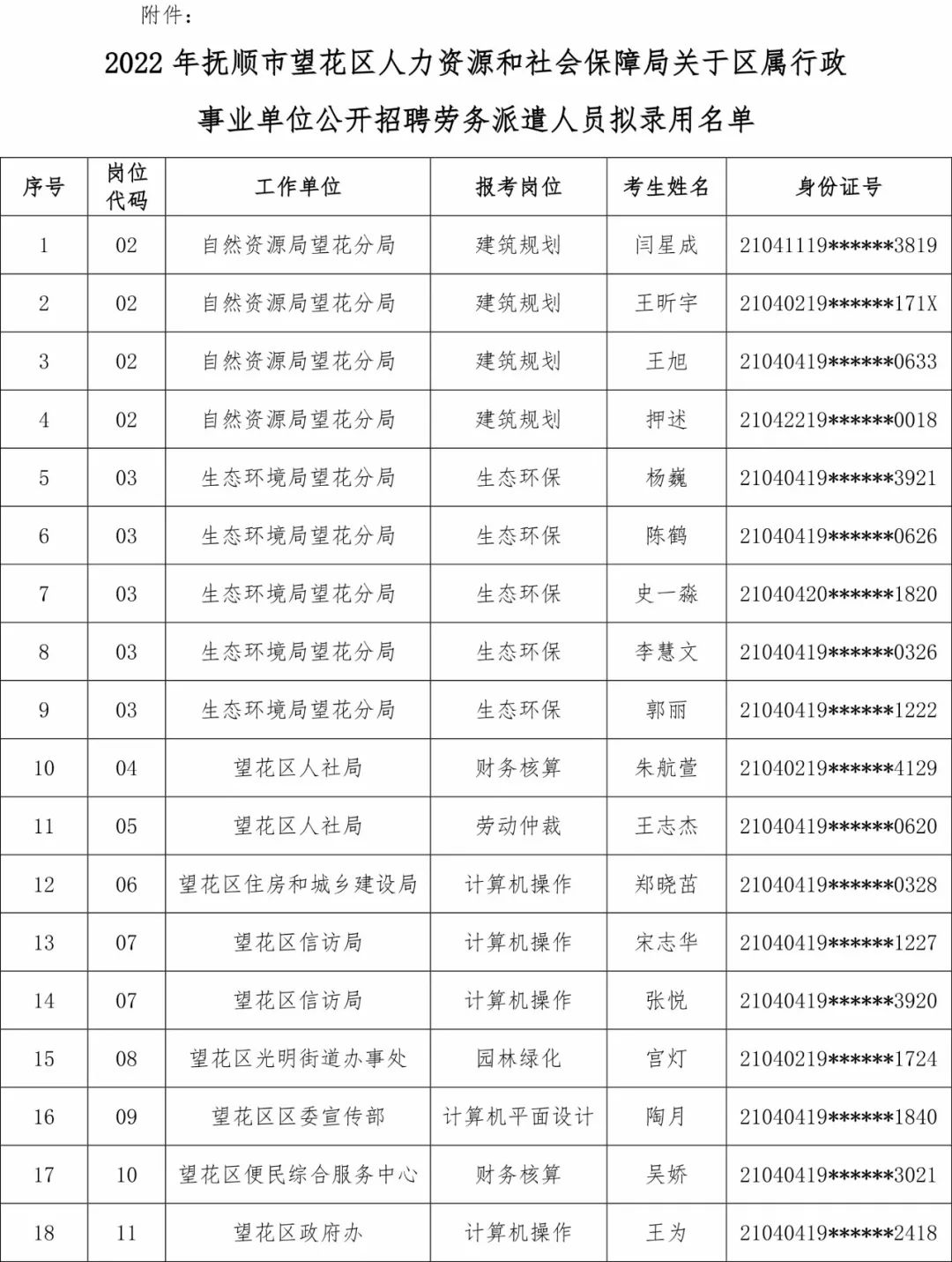 附件:2022年抚顺市望花区人力资源和社会保障局关于区属行政事业单位公开招聘劳务派遣人员拟录用名单