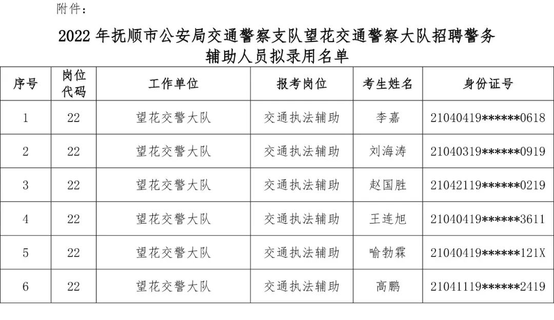 2022年抚顺市公安局交通警察支队望花交通警察大队招聘警务辅助人员拟录用名单公示