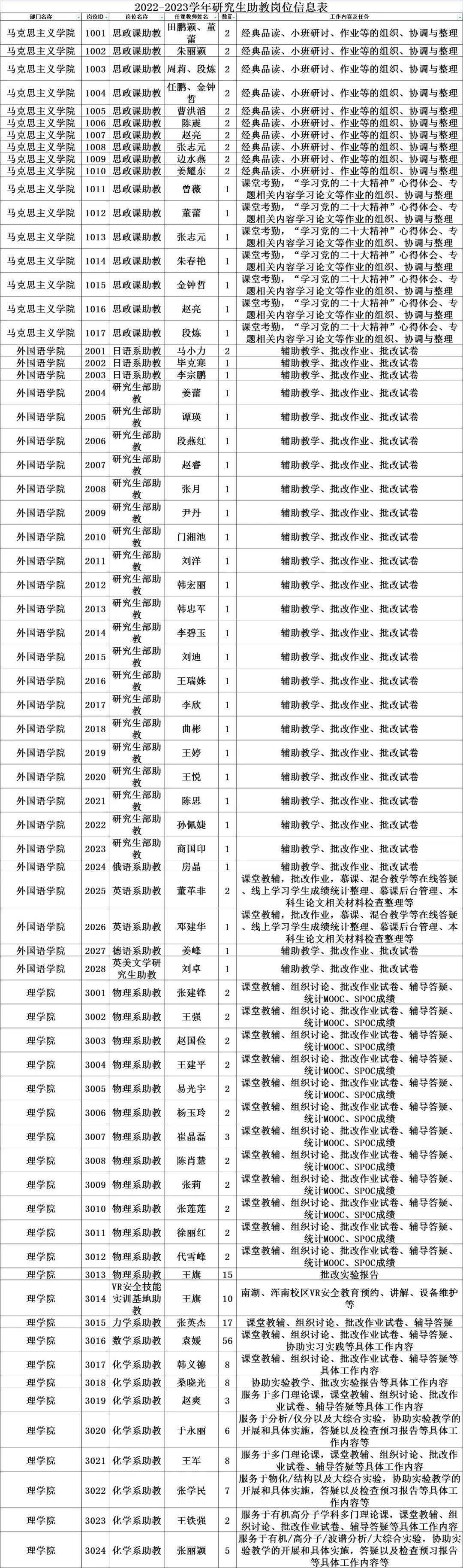 (四)责任心强,身心健康,学有余力,能按期完成培养方案规定的学习和科研任务。本次研究生助教公开招聘岗位共227个,具体岗位名称、招聘人数等详见《2022-2023学年研究生助教岗位信息表》(附件)。为不影响研究生正常学业,并保证助教工作质量,每名研究生每学期最多只能担任一个岗位的助教工作。研究生助教须接受任课教师指导,听从任课教师工作安排,了解教学进度和内容,承担课堂教辅、组织讨论、批改作业试卷、辅导答疑、协助实习实践等教学辅助任务,并参与课程教学准备,研讨式教学、案例教学的组织,协助指导毕业论文(设计)以及任课教师布置的其他与课程相关的教学辅助工作。各岗位工作内容详见附件。研究生助教属于教学辅助性岗位,不得代替课程任课教师的基本教学活动。任何部门和个人不得安排或要求研究生助教承担不属于教学辅助工作范围内的其他工作。研究生助教全额岗位津贴标准为480元/月,全年按10个月发放,每岗位的周标准工作时间为10学时,研究生每月担任助教工作的时间原则上不超过40学时。研究生助教保质保量完成本职工作的,可全额发放岗位津贴;如承担工作量不满基本工作任务时,应按实际承担的工作任务核发津贴。研究生助教定期提交工作任务完成情况,任课教师依据研究生助教的工作内容、工作质量、工作态度等因素综合拟定岗位津贴发放金额,经系所、设岗学院审核后,报人事处备案后发放。对虚报研究生助教工作内容及津贴标准的任课教师,取消其配备研究生助教的资格。符合条件的研究生在一网通办“办事服务大厅”中“研究生兼助教岗位申请”流程中填写申请,经导师和所在学院同意、研究生院资格审查、任课教师选拔、设岗学院审核后报人事处备案,在审批流程结束前不得重复提交申请。报名截止时间为10月9日。技术问题请联系信息化建设与网络安全办公室,联系电话:83687240。附件:2022-2023学年研究生助教岗位信息表.xls