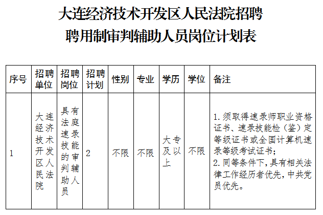 本次招聘岗位为大连经济技术开发区人民法院具有法庭速录技能的聘任制审判辅助人员岗位,共招聘2名,具体岗位报名条件见附件《大连经济技术开发区人民法院招聘聘用制审判辅助人员岗位计划表》。