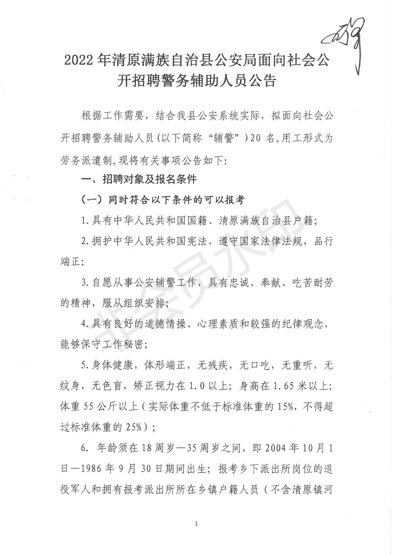 2022年清原满族自治县公安局面向社会公开招聘警务辅助人员20人公告