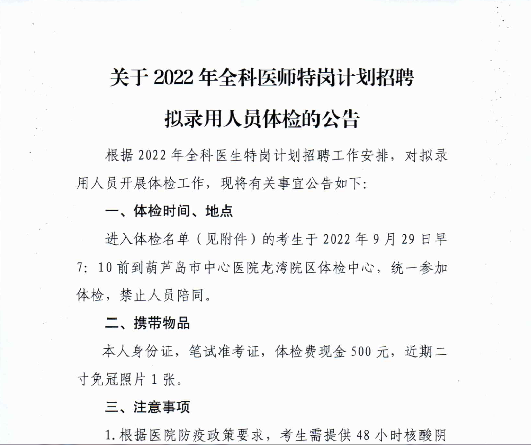 葫芦岛2022年全科医生特岗计划招聘拟录用人员体检公告