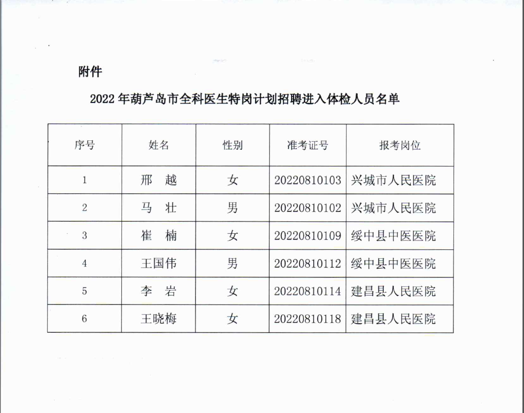 2022年葫芦岛市全科医生特岗计划招聘递补进入体检人员