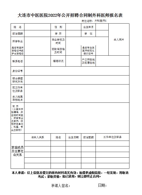 (1)《大连市中医医院2022年公开招聘合同制外科医师报名表》(医院官网www.dl-zyy.com下载);