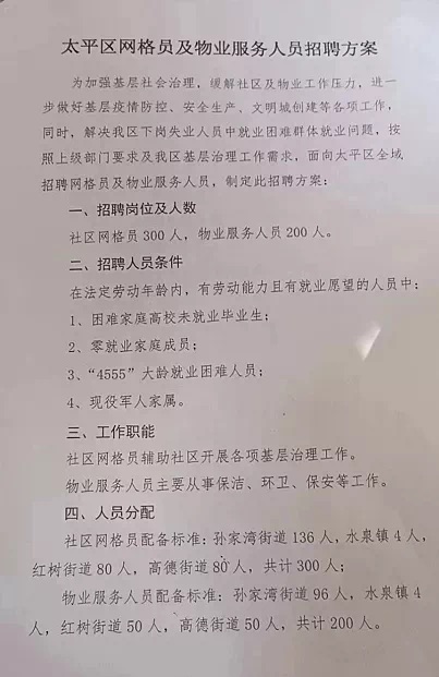 阜新市太平区网格员及物业服务人员500人招聘公告
