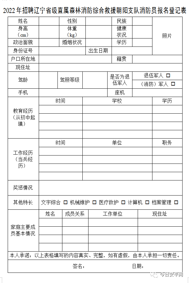 本人为参加2022年度招聘辽宁省级直属森林消防综合救援朝阳支队消防员报名考核的对象,现郑重承诺如下: