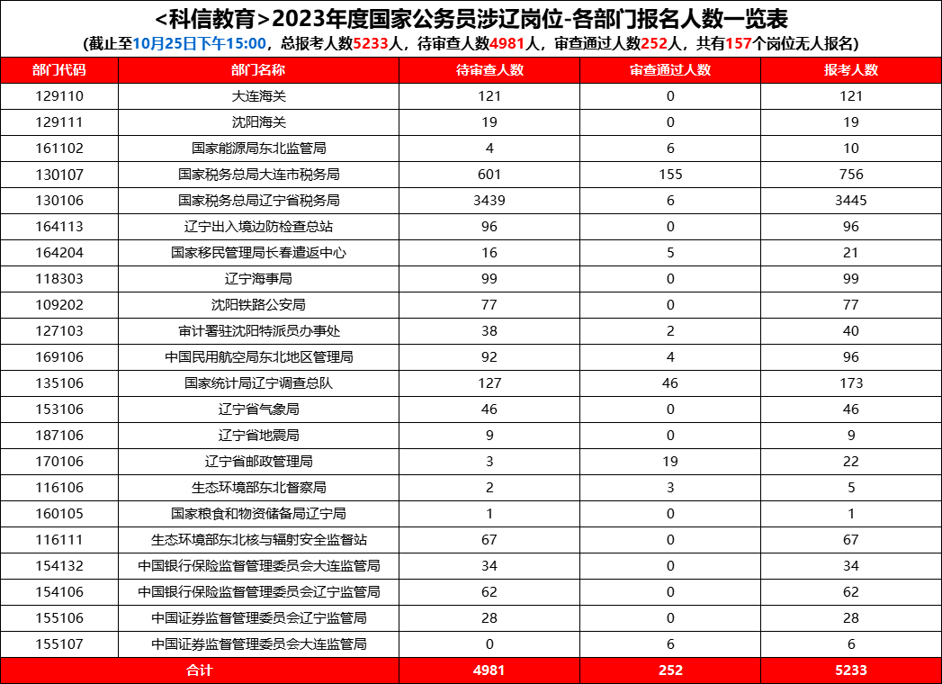 10月25日,进入2023年国考报名第一天,截至当天15时,据科信教育统计,辽宁省报考人数共有5233人,相比2022年辽宁地区国考报名人数同期增加了2220人。此次国考首日报名共有157个职位无人报考,其中待审核人数为4981人,通过审核人数为252人。