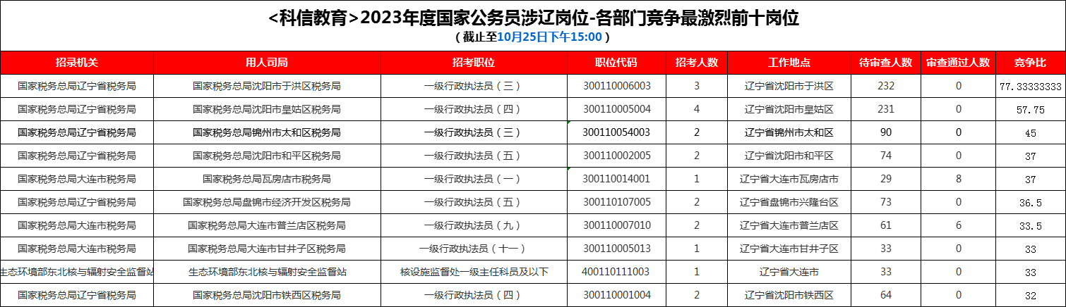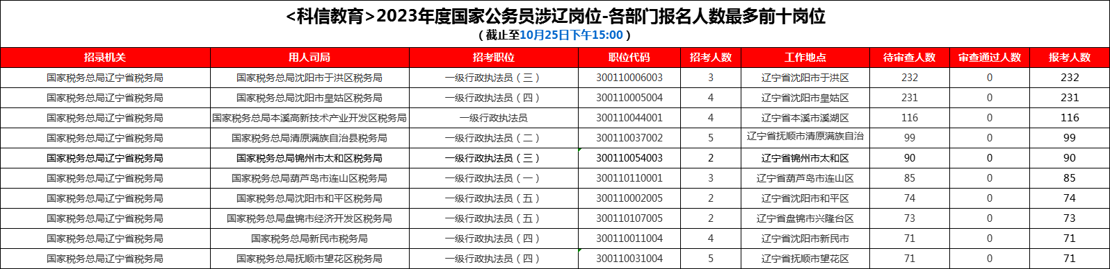 截至25日15时,通过审核人数前三位的部门都是国家税务总局大连市税务局。科信教育老师提醒,报名初期审查速度较慢,因此待审查人数较多,考生们要耐心等待,切勿心急。
