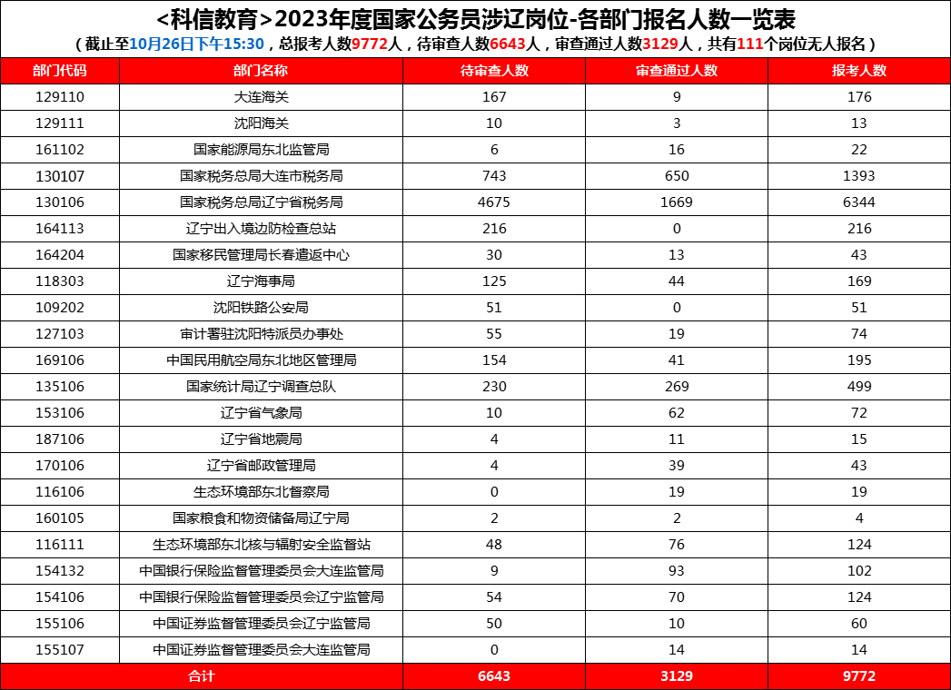 2023年国考报名第二天,热度初显,据科信教育统计,截至26日15时30分,涉辽岗位已有9772人报名,报考人数较昨日有明显增加,其中3129人通过审查,还有111个职位无人报名。