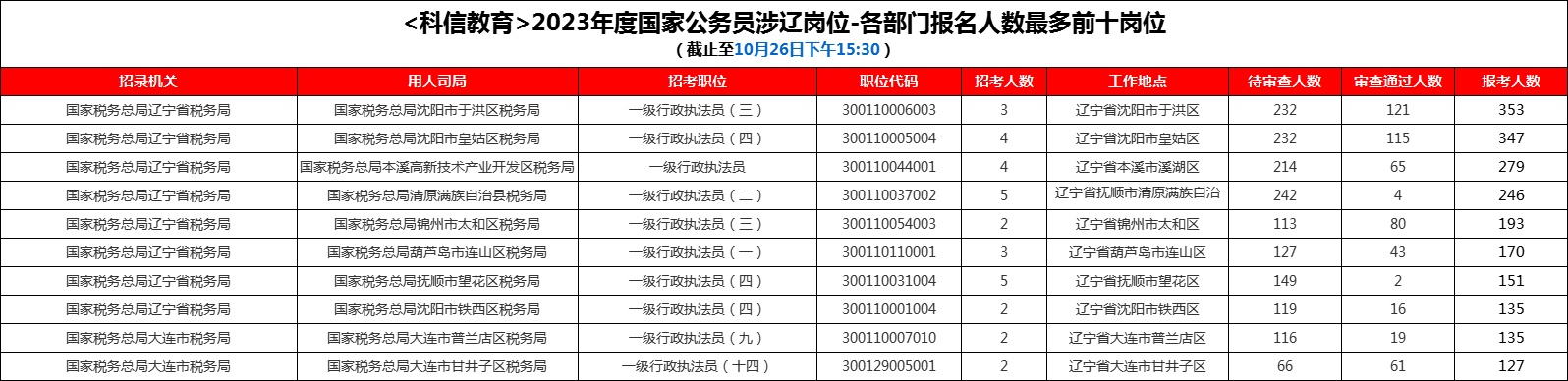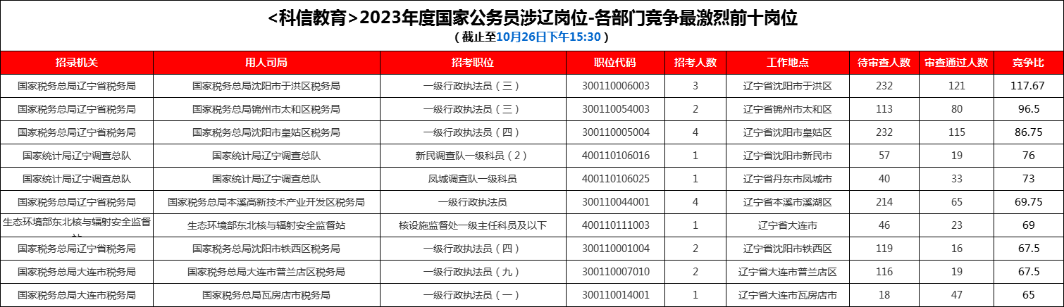 据科信教育统计,国考涉辽岗位竞争比破百的岗位只有:“国家税务总局沈阳市于洪区税务局-一级行政执法员(三)”,但目前竞争最激烈的前十个岗位中最低的竞争比也已经突破65:1,科信教育老师建议考生可以尽量选择竞争比较低的岗位,增加进面的机率。具体信息如下: