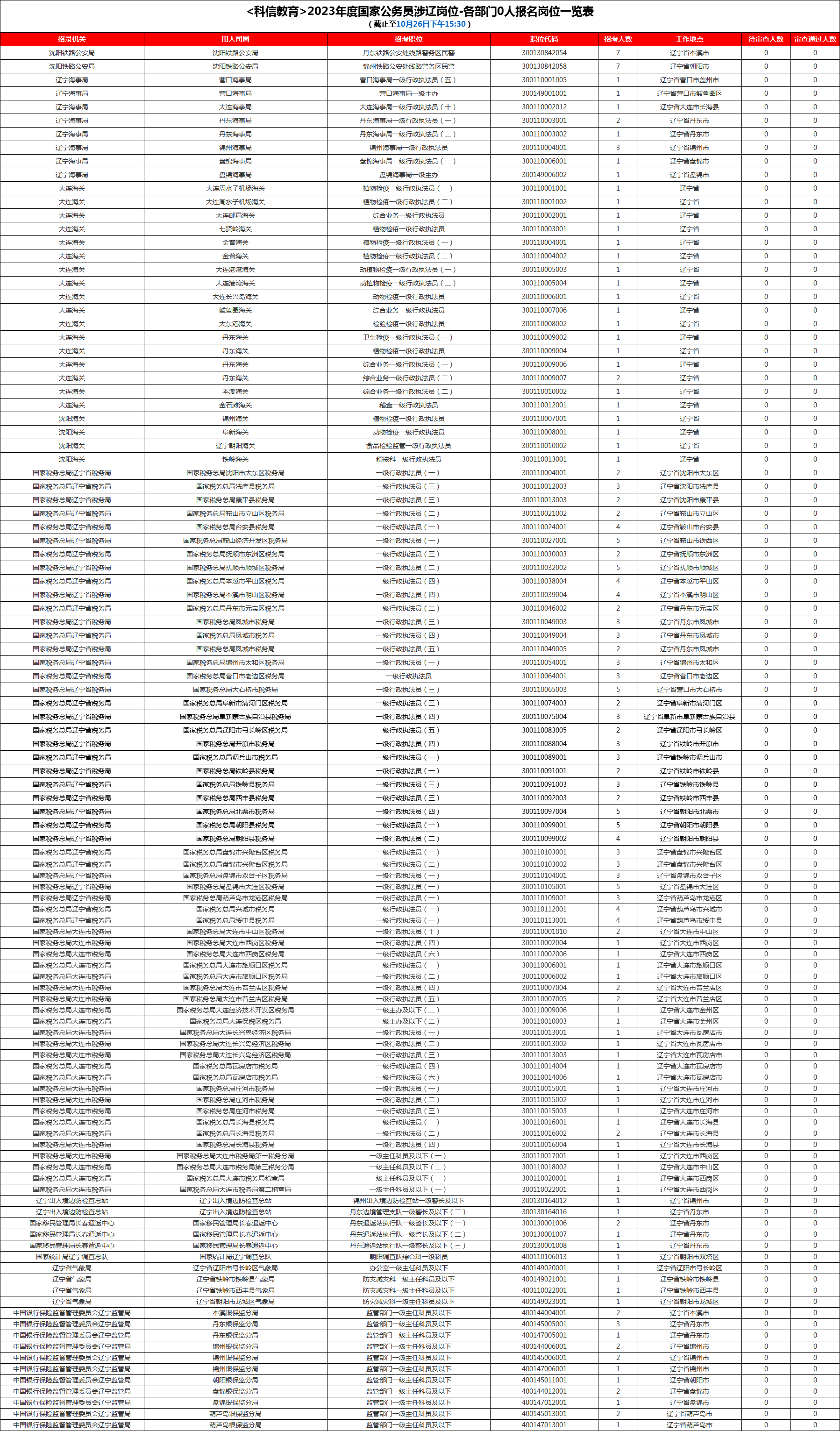 据科信教育统计,截至26日15时30分,涉辽的725个职位中,报名总人数(待审核人数与审核通过人数的和)前三的部门分别为国家税务总局辽宁省税务局(6344人)、国家税务总局大连市税务局(1393人)、国家统计局辽宁调查总队(499人)。