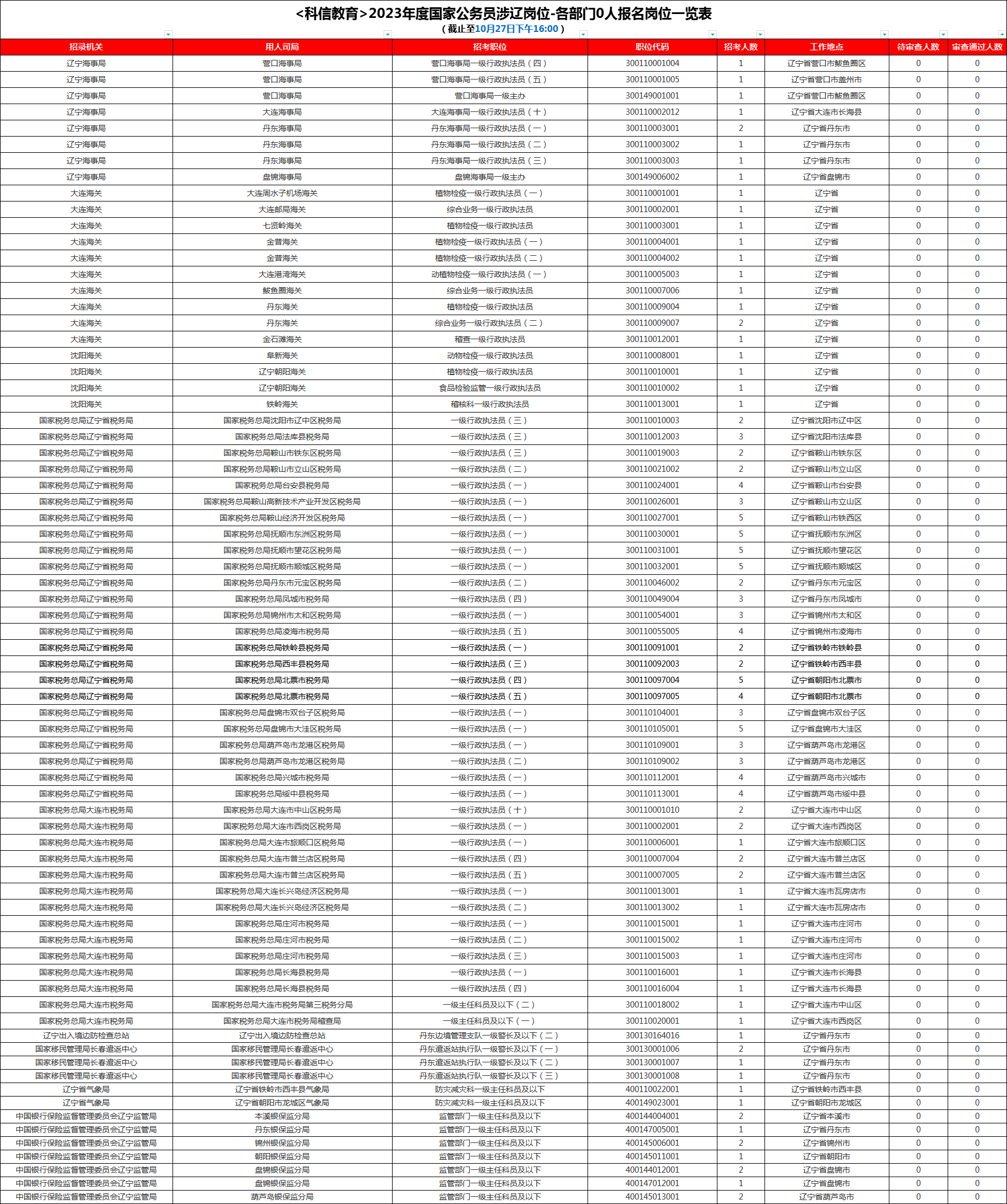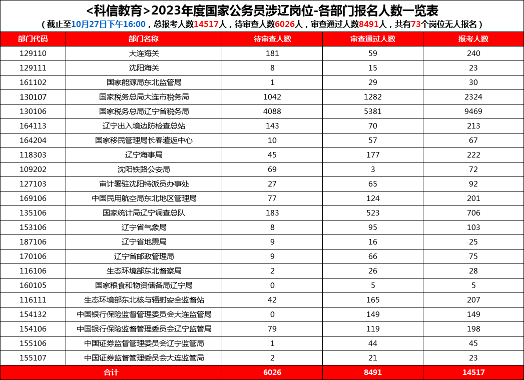 10月27日是国考报名第三天,相比前两天,报名人数有明显提升。据科信教育统计,截止16时,辽宁地区报名人数已经接近一万五千人,8491人通过审核,较昨日16时增加了5362人,与去年同期数据相比有大幅增加,共有73个职位未受到考生关注,约占总职位数的10.1%