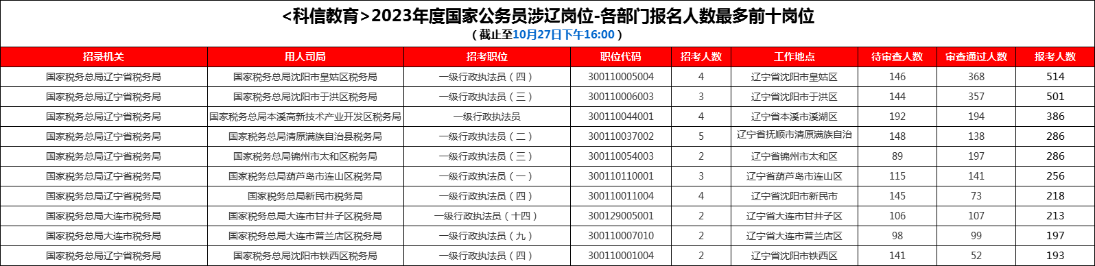 据科信教育统计,截至27日16时,作为国考的招录大户,税务系统“雄霸天下”的局面依然持续,报名人数最多前十部门中全部为税务部门,预计未来几天人数可能还会上涨,报名人数最多的是国家税务总局辽宁省税务局部分 国家税务总局沈阳市皇姑区税务局”一级行政执法员(四)“一职,目前已经514人报名,368人通过审核,以微弱优势领先,位居第二的国家税务总局辽宁省税务局部分 国家税务总局沈阳市于洪区税务局的“一级行政执法员(三)”报名人数有501人,预计后期报名人数还会上涨。