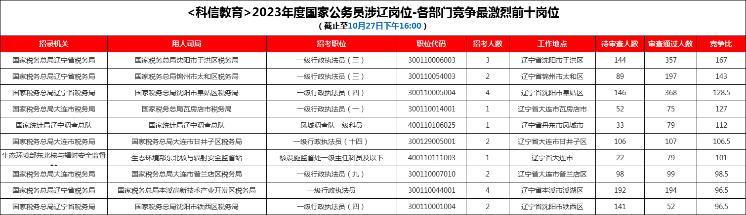 报名第三天,国家税务总局辽宁省税务局部门国家税务总局沈阳市于洪区税务局的”一级行政执法员(三)“一职,依旧占据竞争最激烈部门冠军宝座,竞争比已经高达167:1,尚有144人处于待审核状态,报名开始以来一直高居竞争比的榜首,并且报名人数还在不断的上涨。该部门吸引了广大考生扎堆报考,说明考生更倾向于选择限制少的职位。科信教育提醒尚未出手的考生们在选择职位时最好避开这样的热门职位,避开拥挤,寻求竞争对手相对较少的职位。