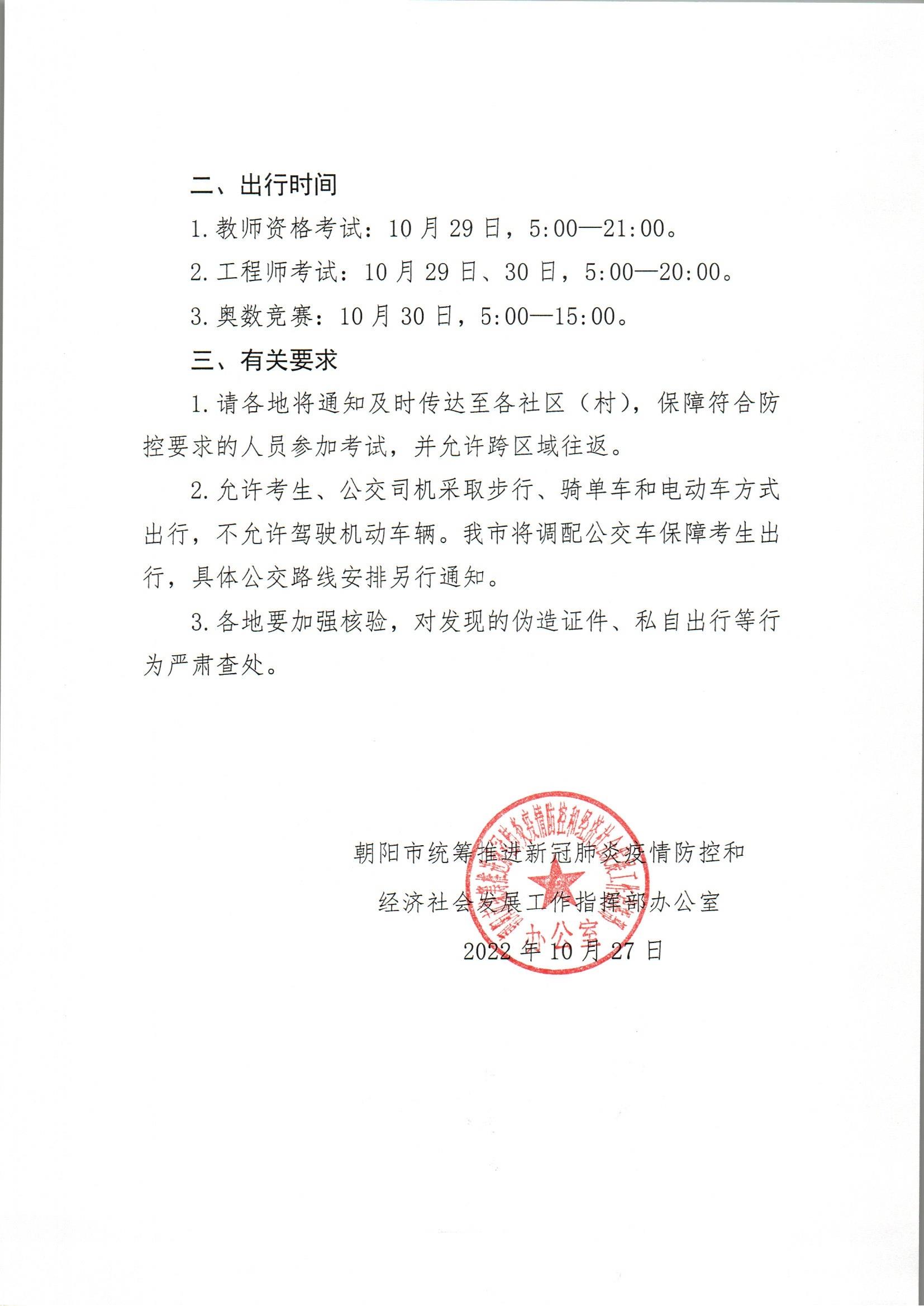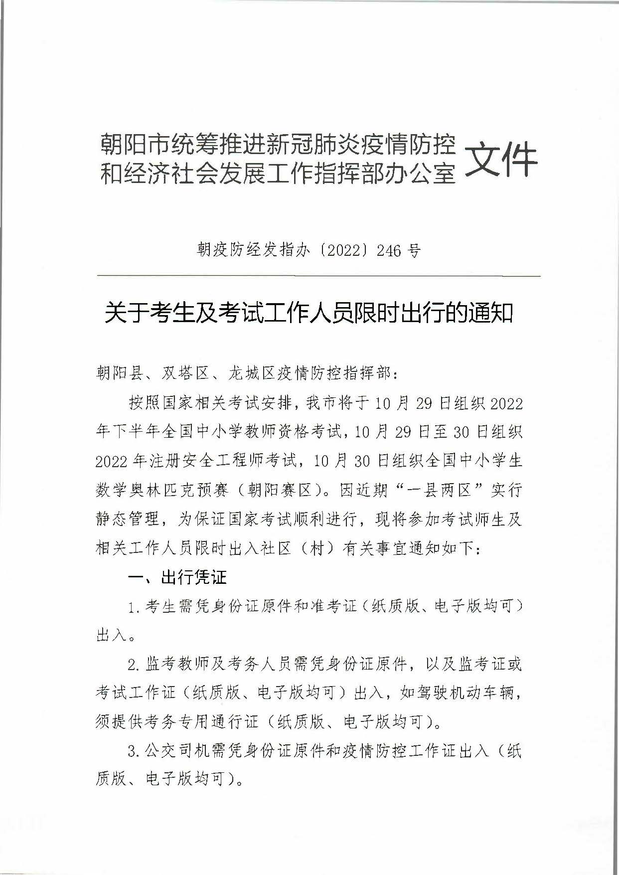 关于朝阳市考试考生及考试工作人员限时出行的通知