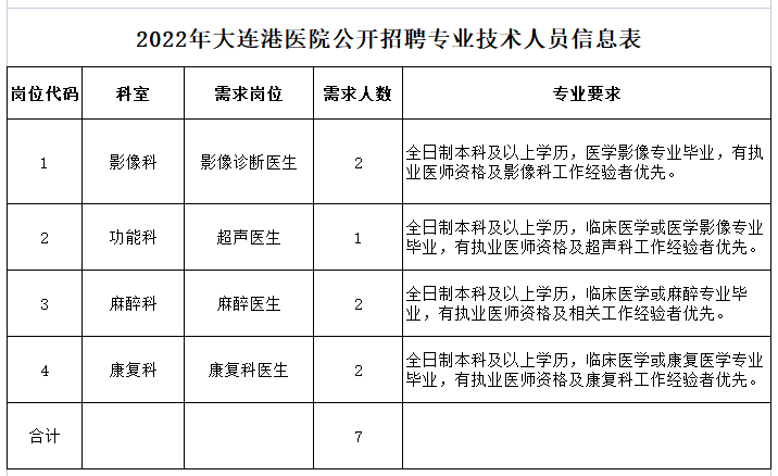 5、岗位所需要的其他条件,详见《2022年大连港医院公开招聘专业技术人员信息表》(附件1)。