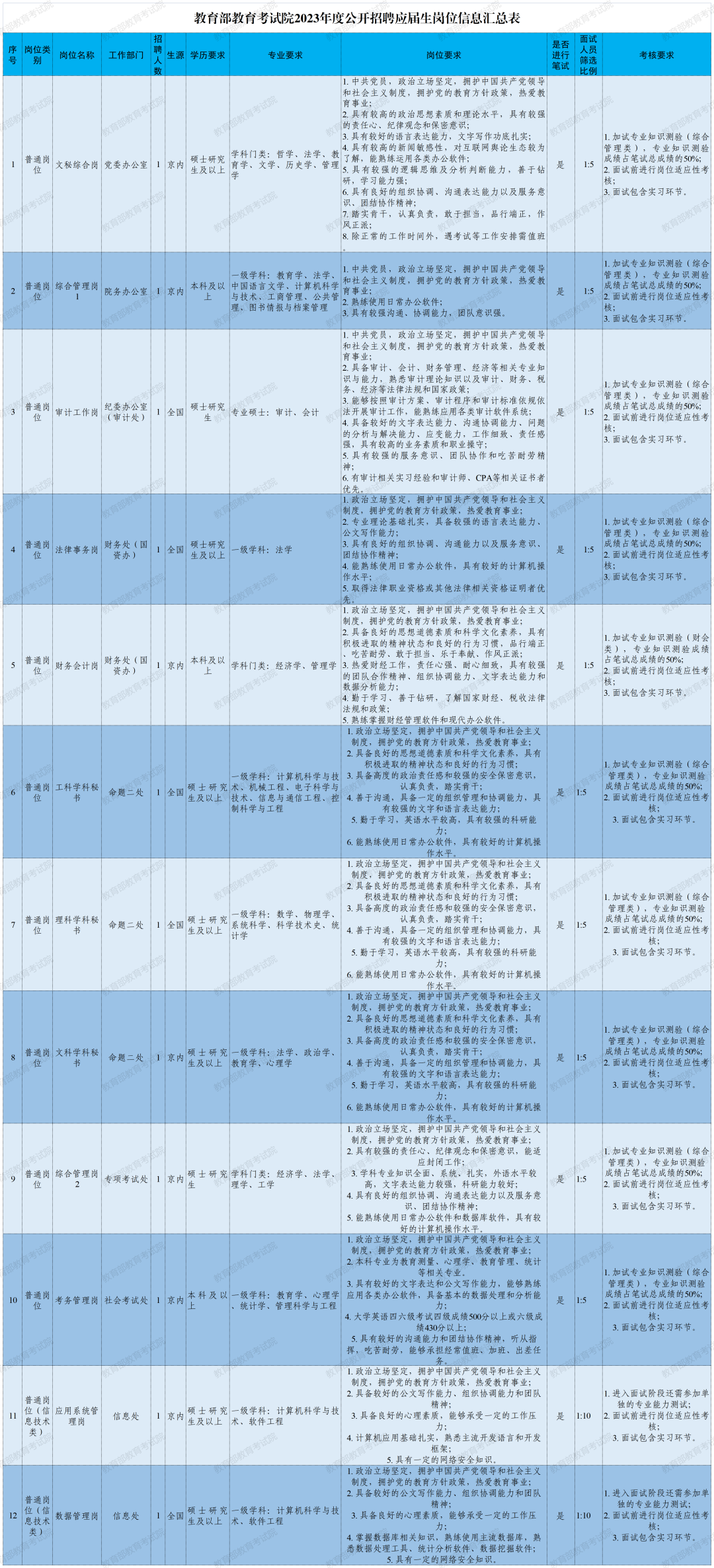①根据笔试成绩由高到低的顺序,一般岗位按照1:5的比例确定进入面试人员,信息技术类岗位按照1:10的比例确定进入面试人员。是否进入面试请及时查看面试公告。