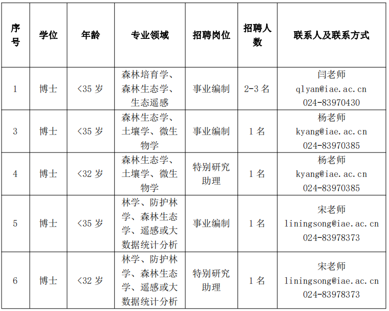 因学科发展和科研工作需要,中国科学院沈阳应用生态研究所次生林生态与经营组拟招聘事业编制人员、特别研究助理若干名。主要从事森林培育学、森林生态学、防护林学、生态遥感学、土壤学、微生物学等领域相关研究。