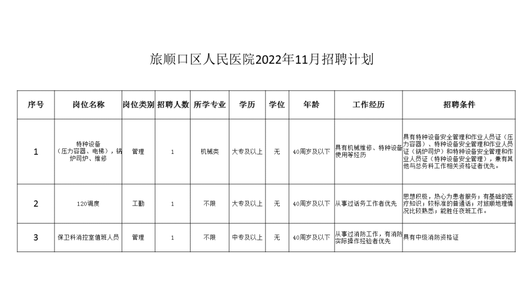 旅顺口区人民医院建院于1945年,是一所集医疗、教学、预防、康复于一体的三级综合医院,是全区人民的医疗中心、急救中心、体检中心。为了满足医院各学科的发展以及人才梯队建设,现面向社会公开招聘合同制工作人员3名。