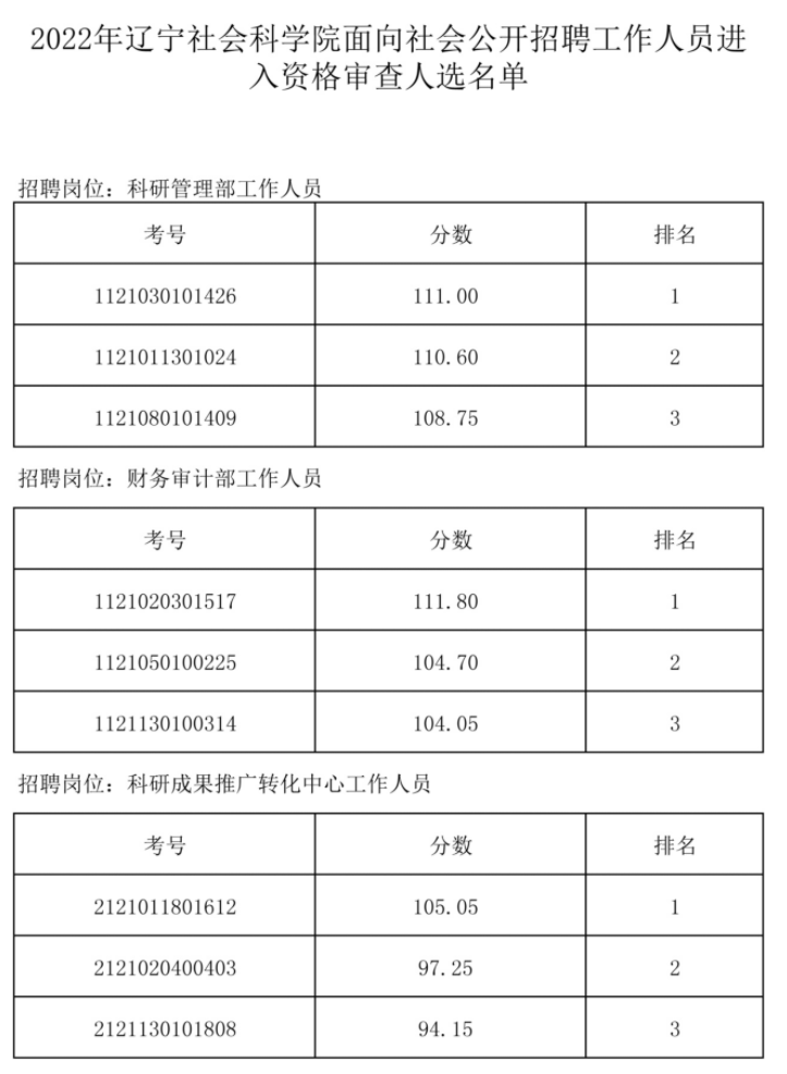 2022年辽宁社会科学院笔试成绩合格分数线为:综合管理类(A类)75分,社会科学专技类(B类)67.5分。根据《辽宁省省直事业单位2022年上半年集中面向社会公开招聘工作人员公告》,在成绩合格人选中,根据公布的面试比例,按照笔试成绩从高分到低分排序,确定各岗位资格审查人选。最后一名资格审查人选的笔试成绩并列者,同时参加资格审查。当出现资格审查人选未达到规定比例时,按实有人数确定资格审查人选。参加资格审查人选名单见附件1.