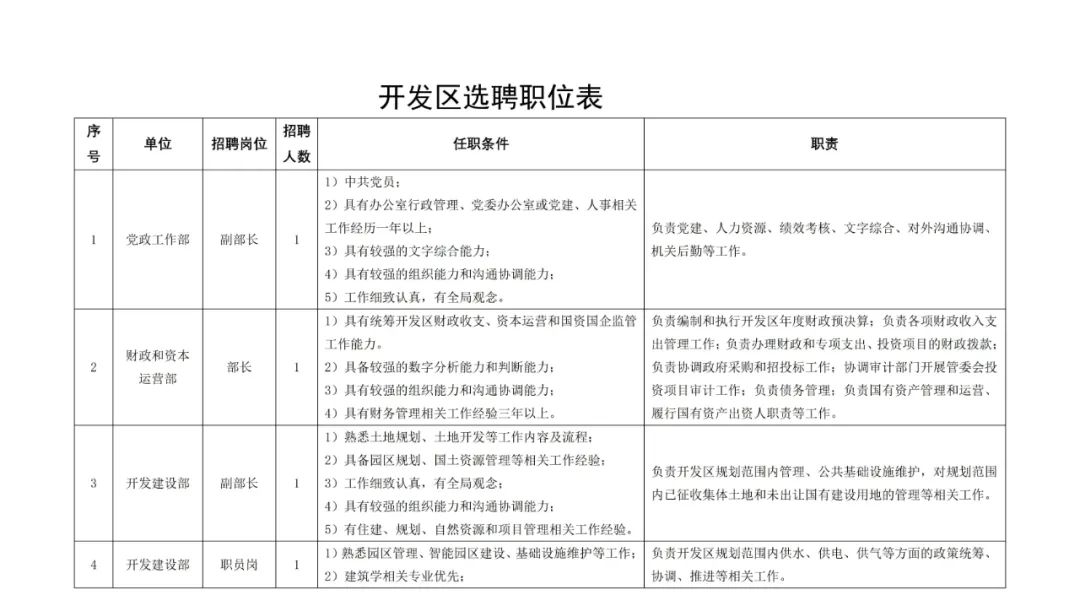 (一)表现特别优秀或因岗位特别需要的报名人员,经招聘工作领导小组研究同意,聘任的资格条件可适当放宽。其他资格条件详见《开发区选聘职位表》(附件1)