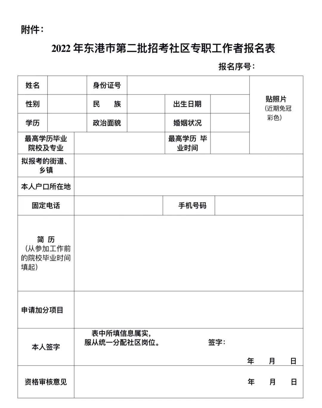 附件:《2022年东港市第二批招考社区专职工作者报名表》
