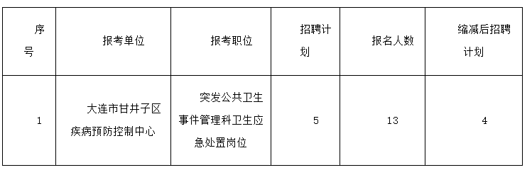 大连市甘井子区2022年教育系统、卫健系统事业单位公开工作人员报名及缴费工作已于12月30日16:00结束。根据《大连市甘井子区2022年教育系统、卫健系统事业单位公开工作人员公告》的规定,现对未达到3:1竞争比例的岗位予以缩减,具体公告如下: