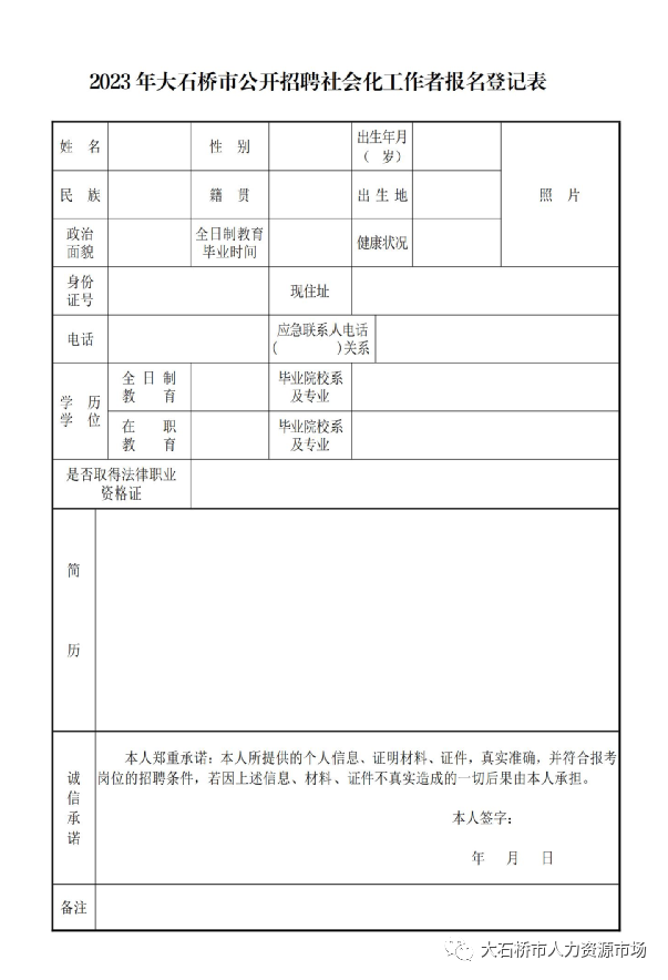 1、在本公告附件中下载并如实填写《2023年大石桥市公开招聘社会化工作者报名登记表》 2份。
