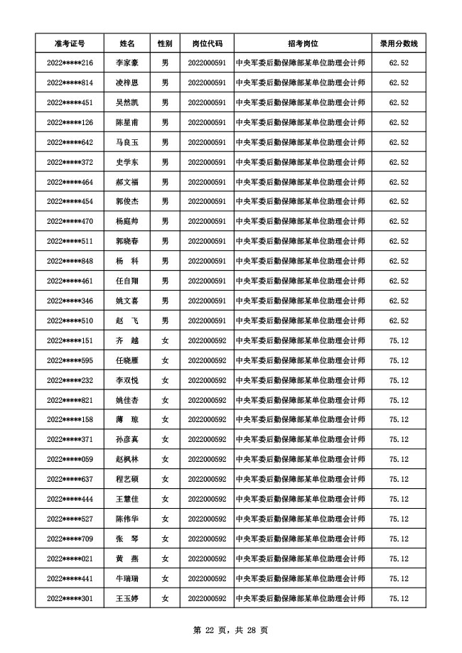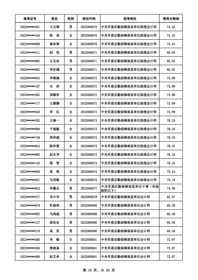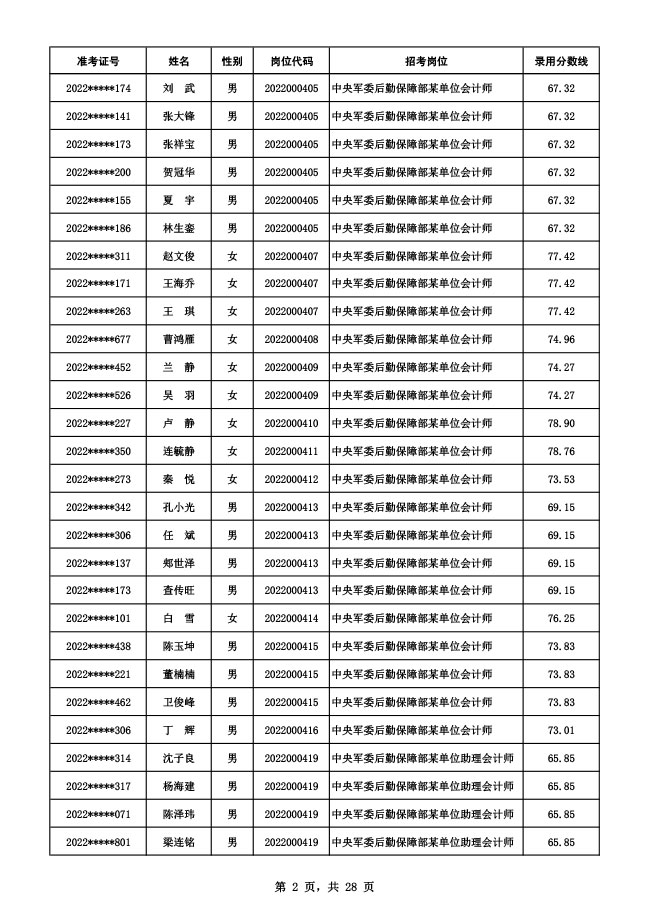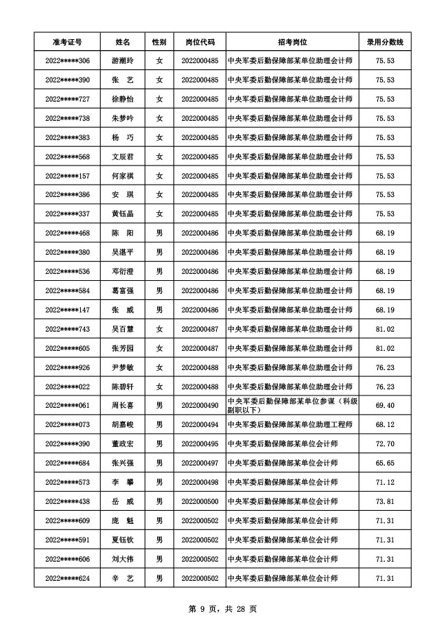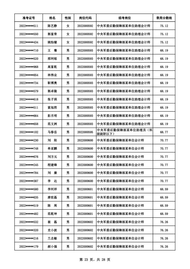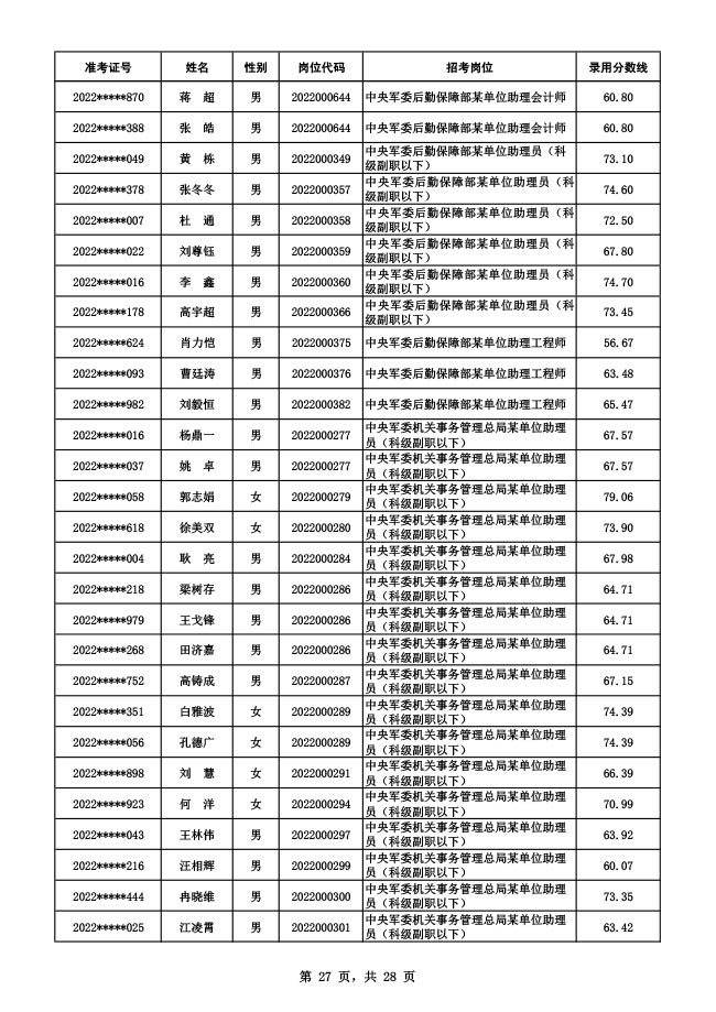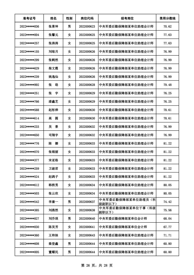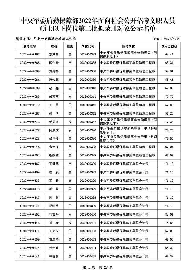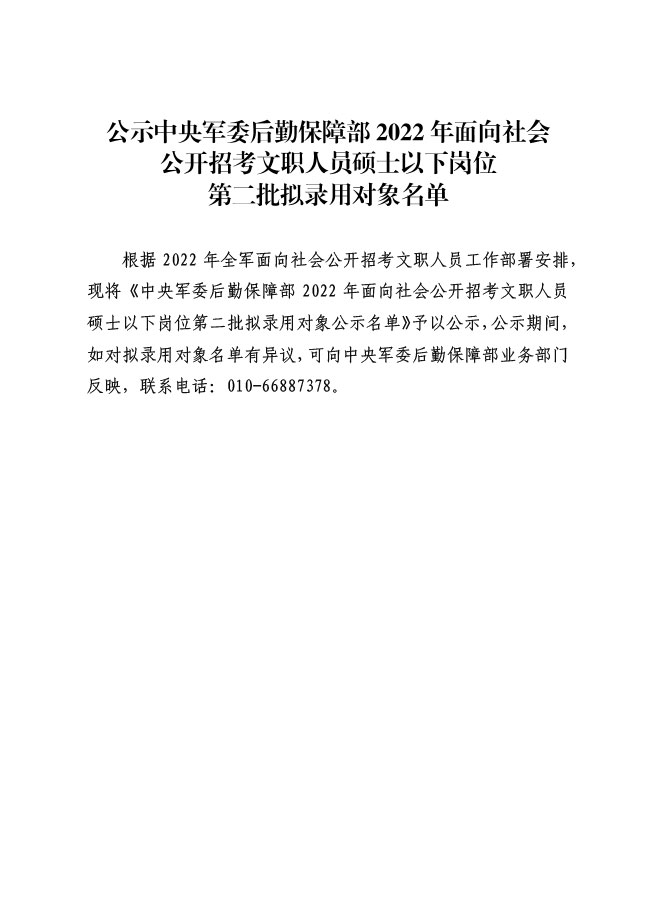 公示中央军委后勤保障部2022年面向社会公开招考 文职人员硕士以下岗位第二批拟录用对象名单