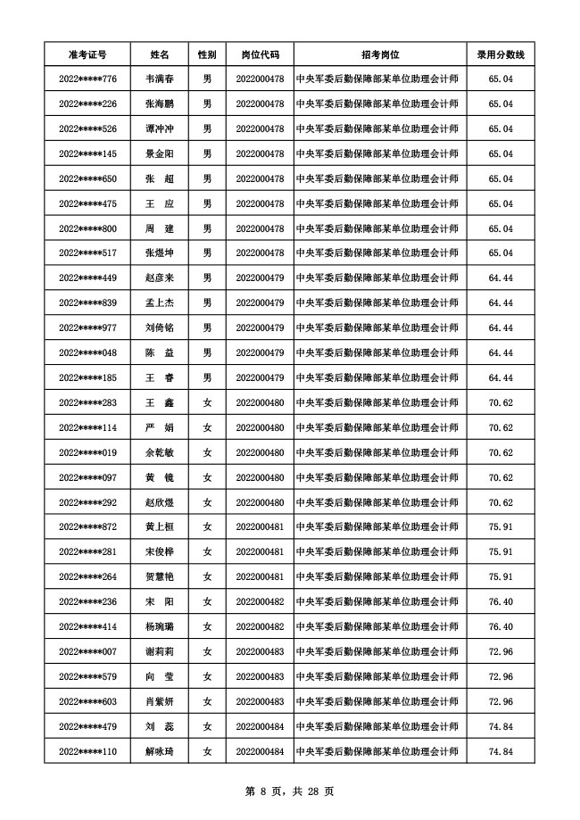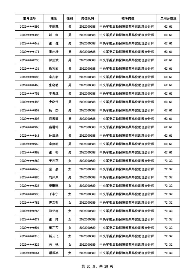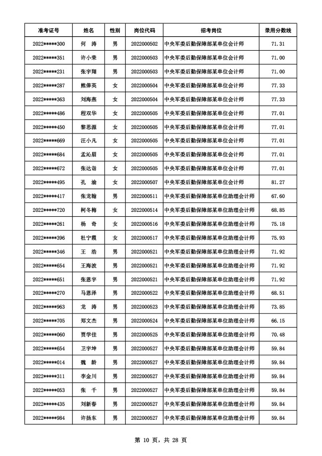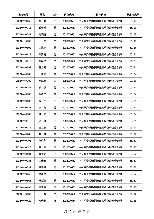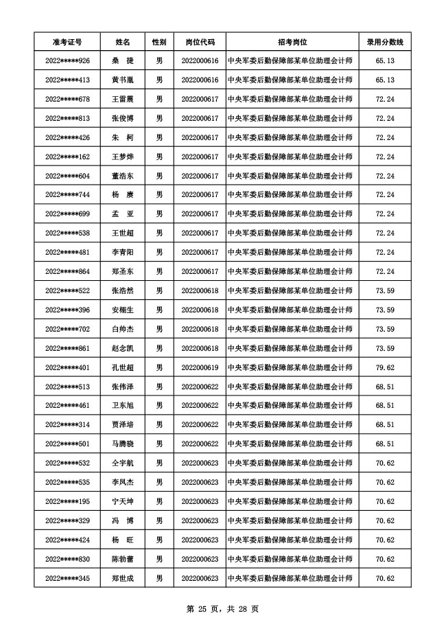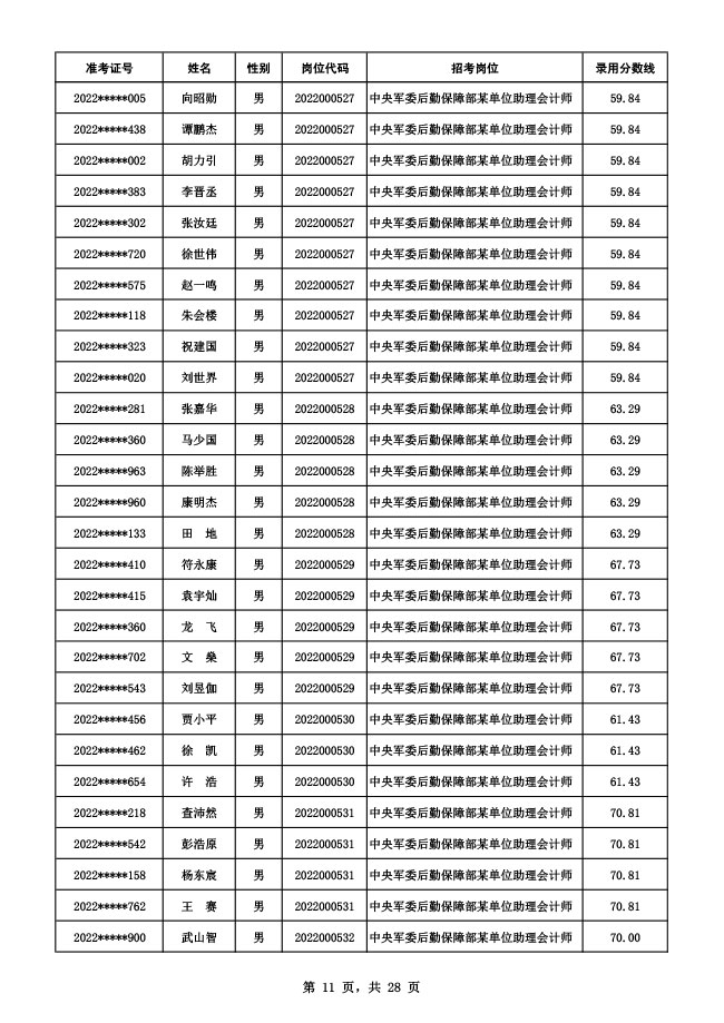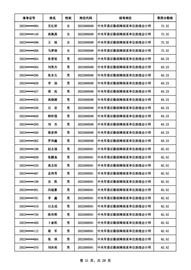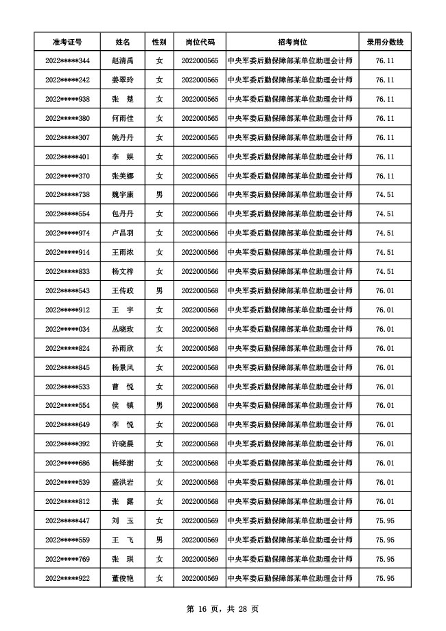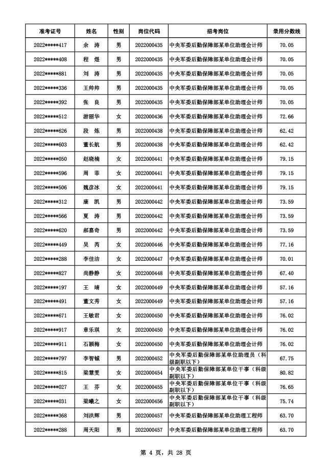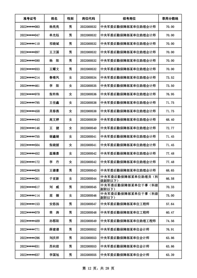 公示中央军委后勤保障部2022年面向社会公开招考 文职人员硕士以下岗位第二批拟录用对象名单