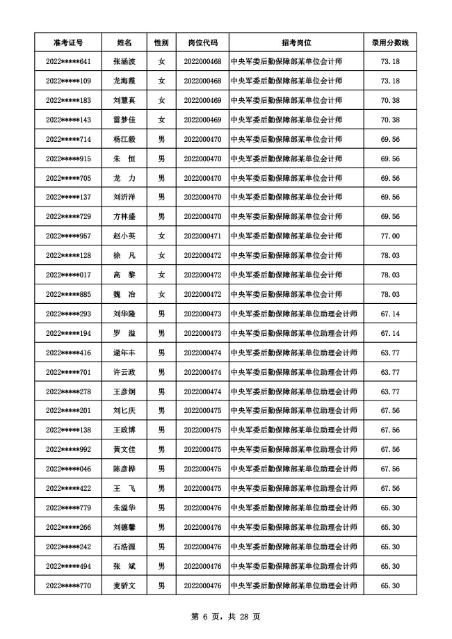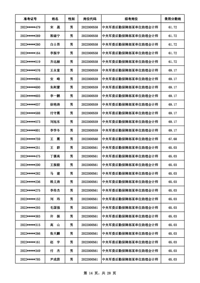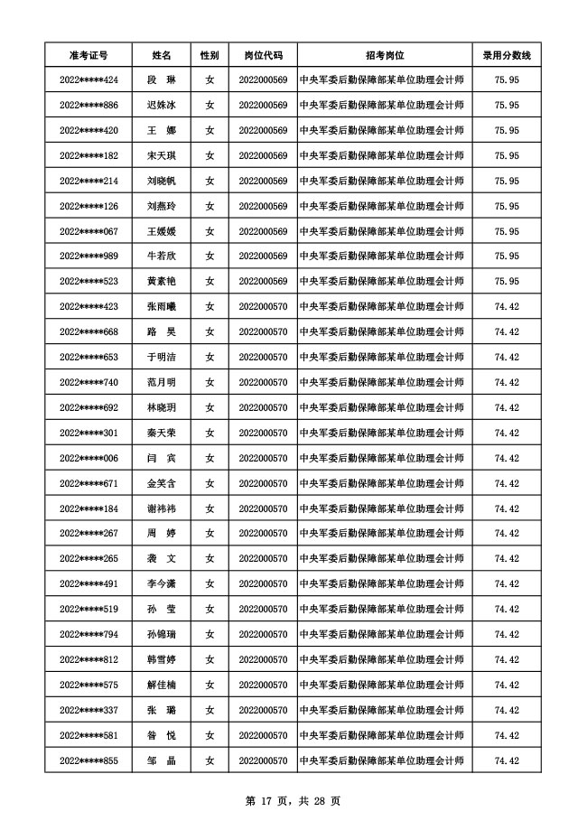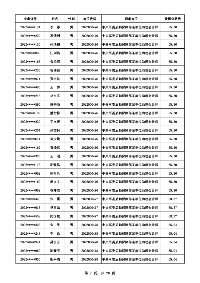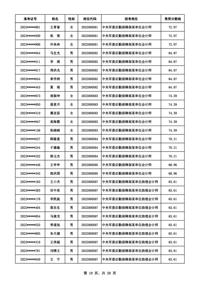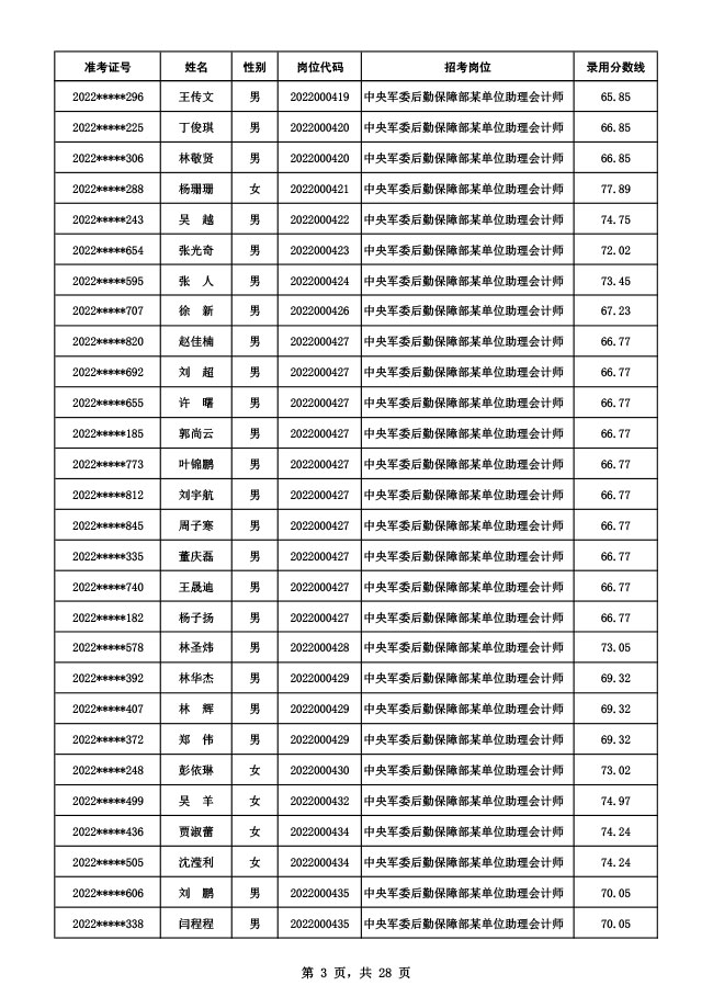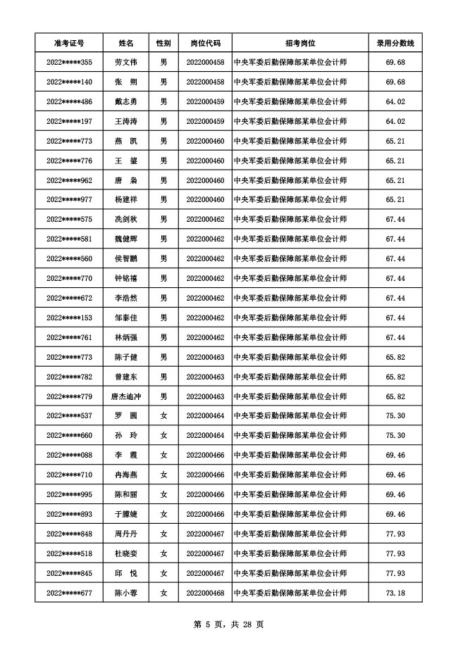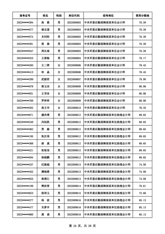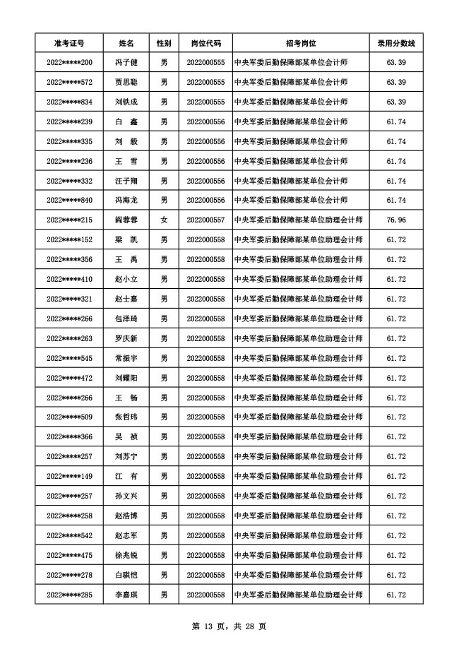 公示中央军委后勤保障部2022年面向社会公开招考 文职人员硕士以下岗位第二批拟录用对象名单