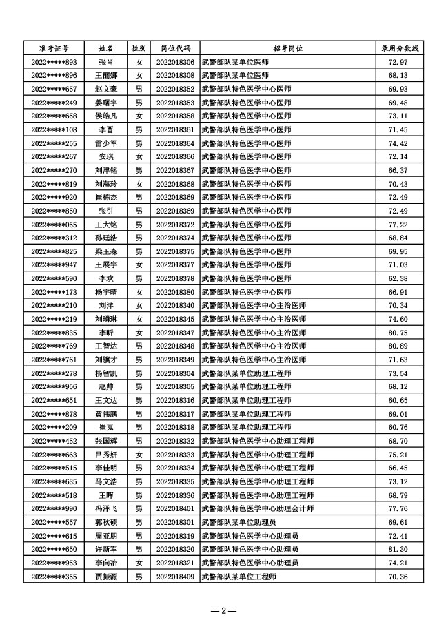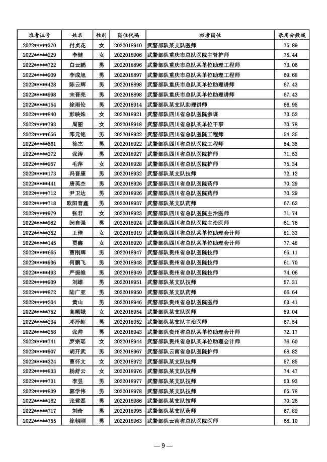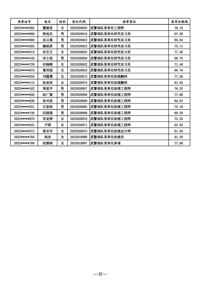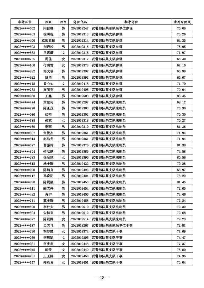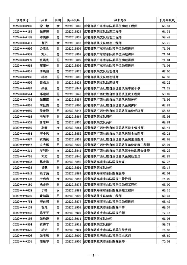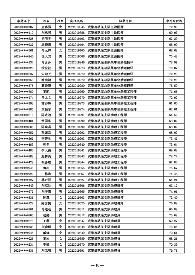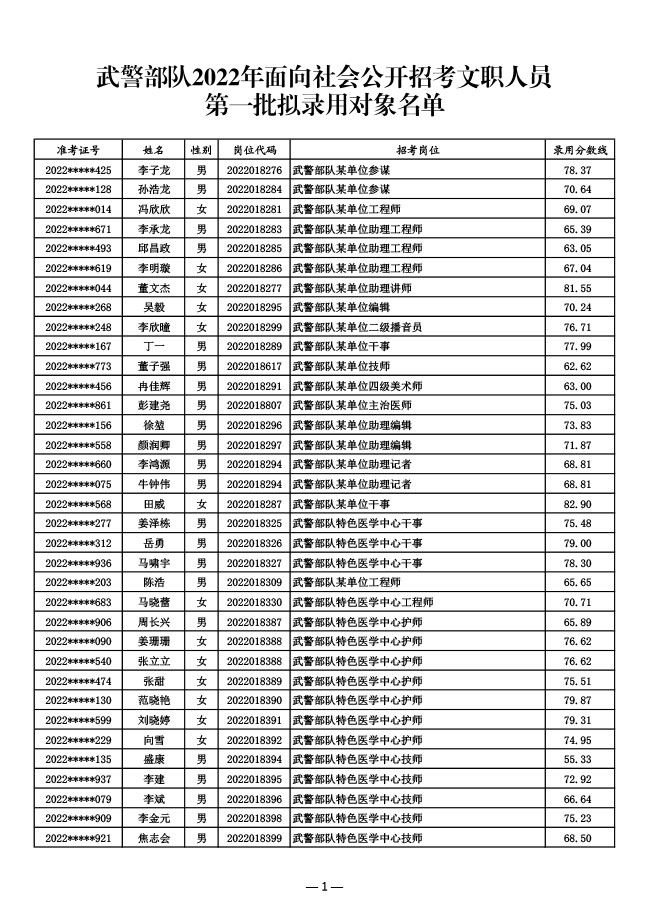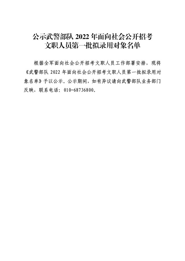 公示武警部队2022年面向社会公开招考 文职人员第一批拟录用对象名单