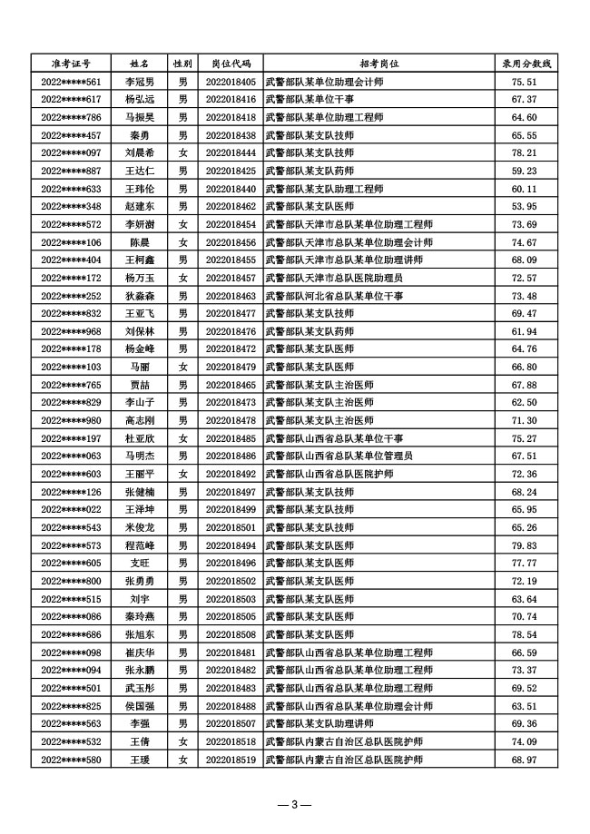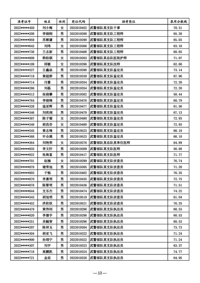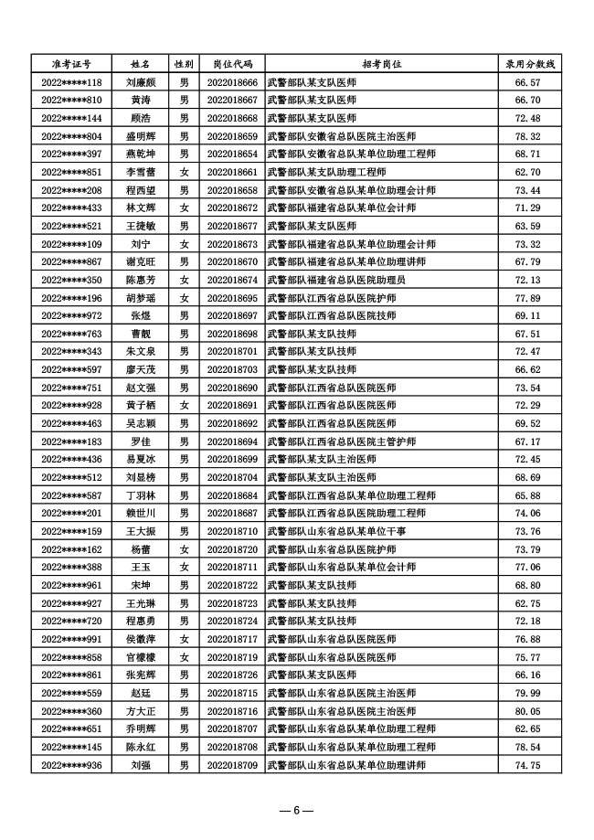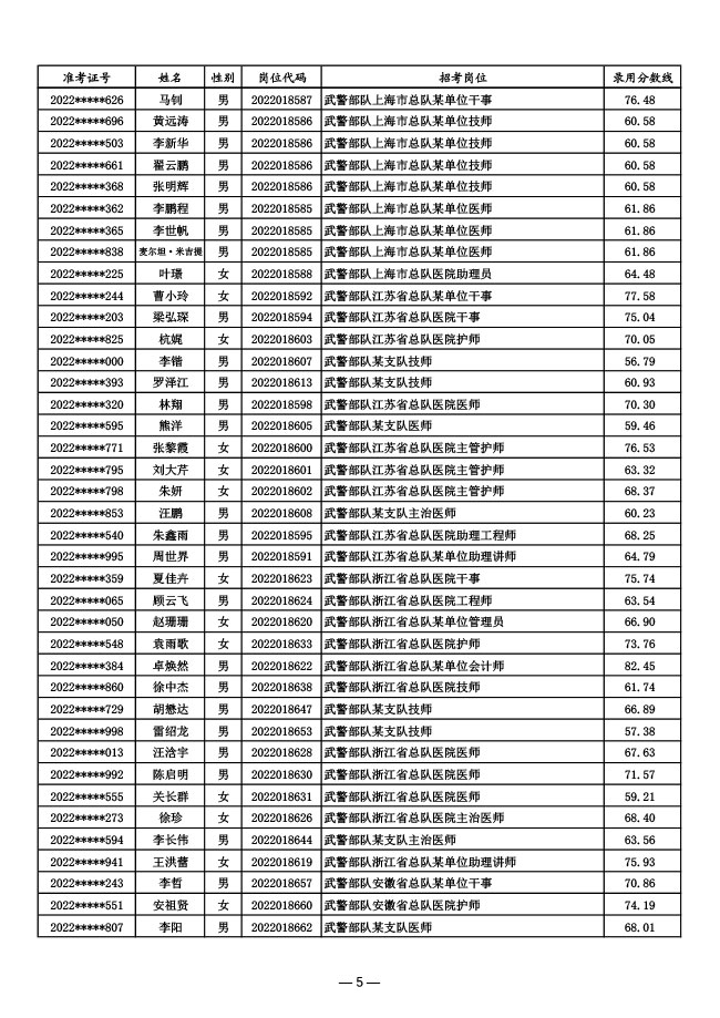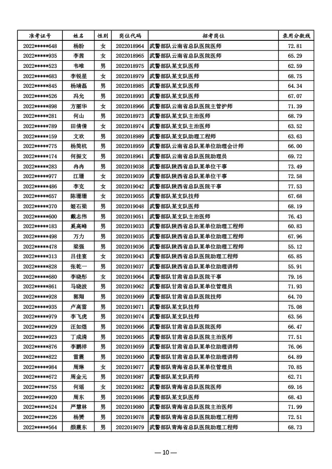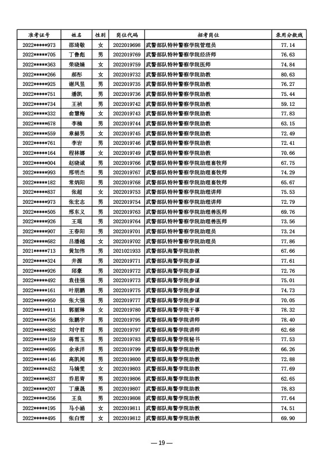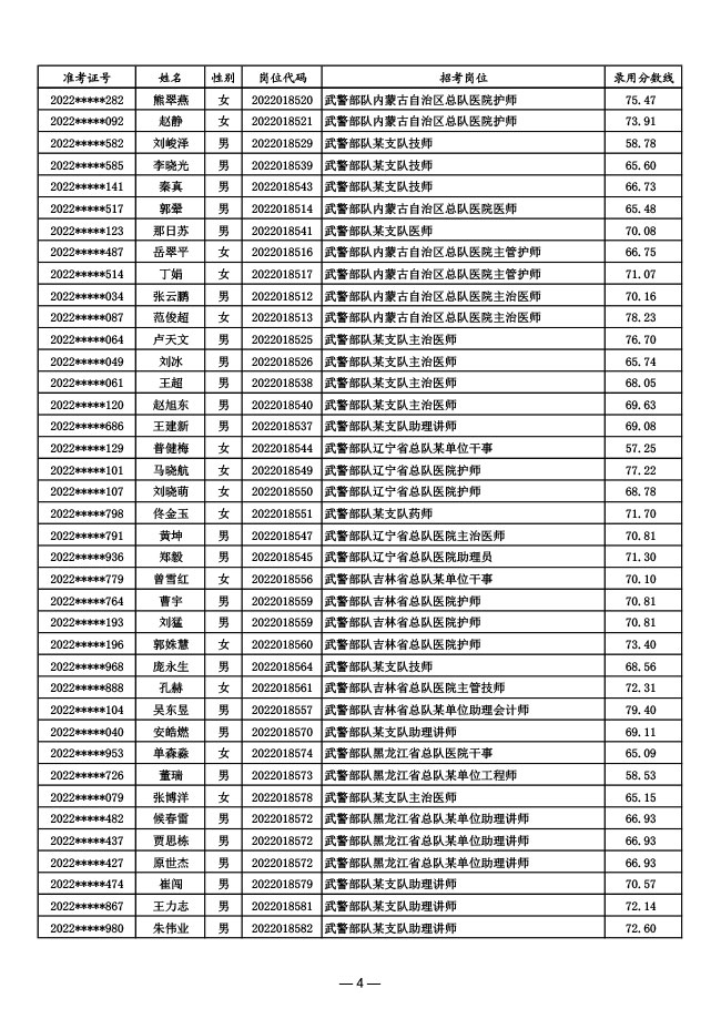 公示武警部队2022年面向社会公开招考 文职人员第一批拟录用对象名单