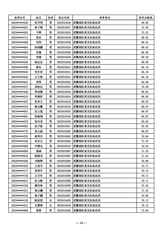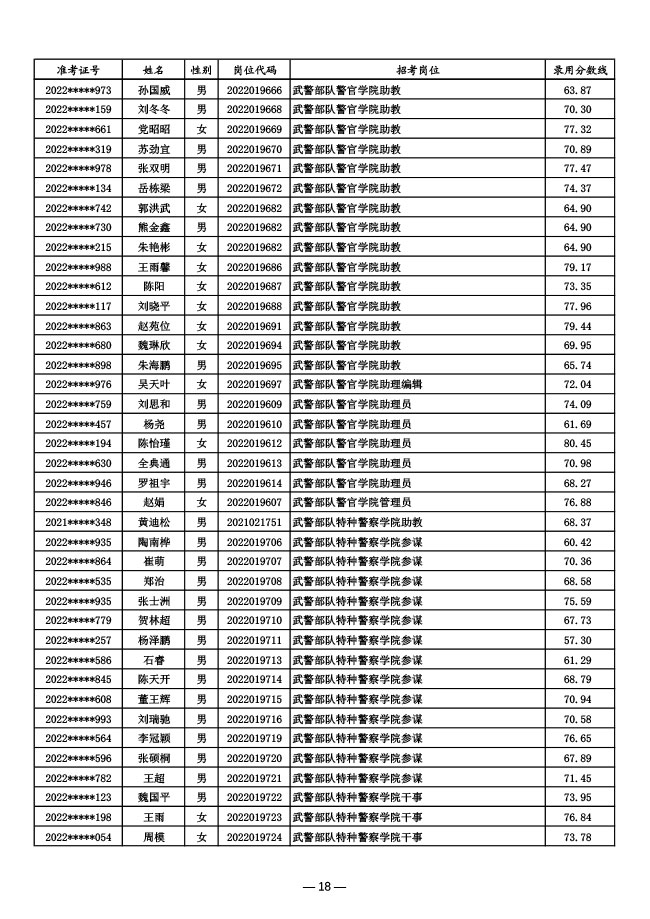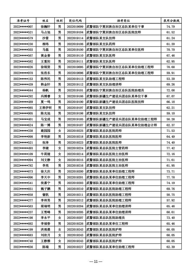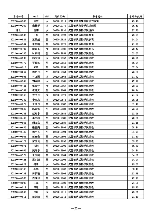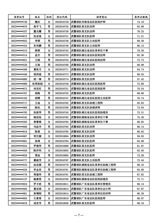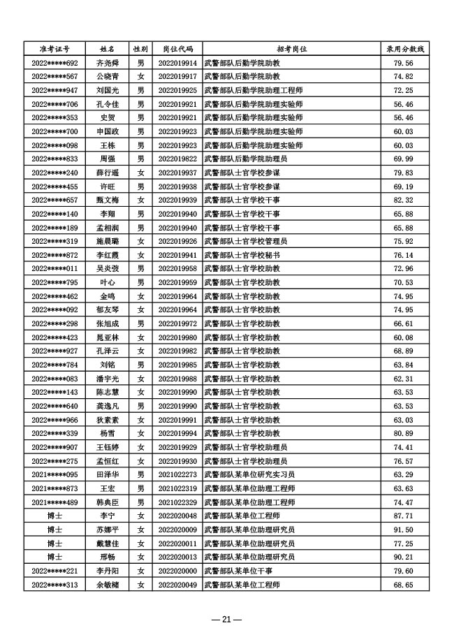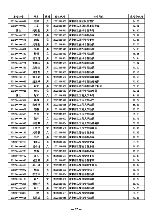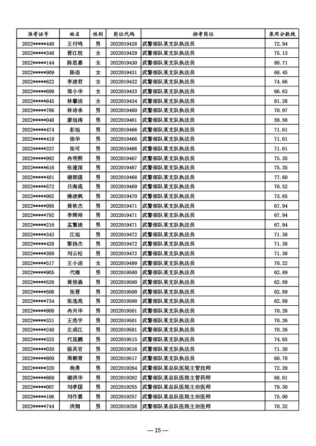 公示武警部队2022年面向社会公开招考 文职人员第一批拟录用对象名单