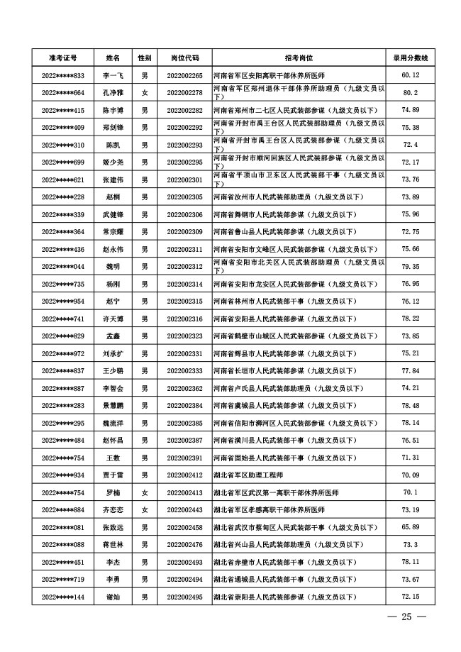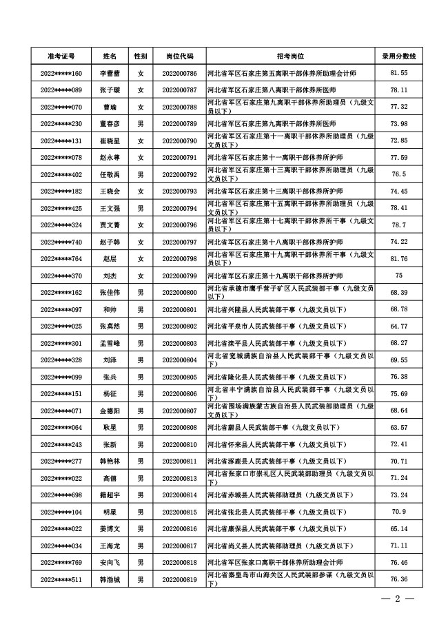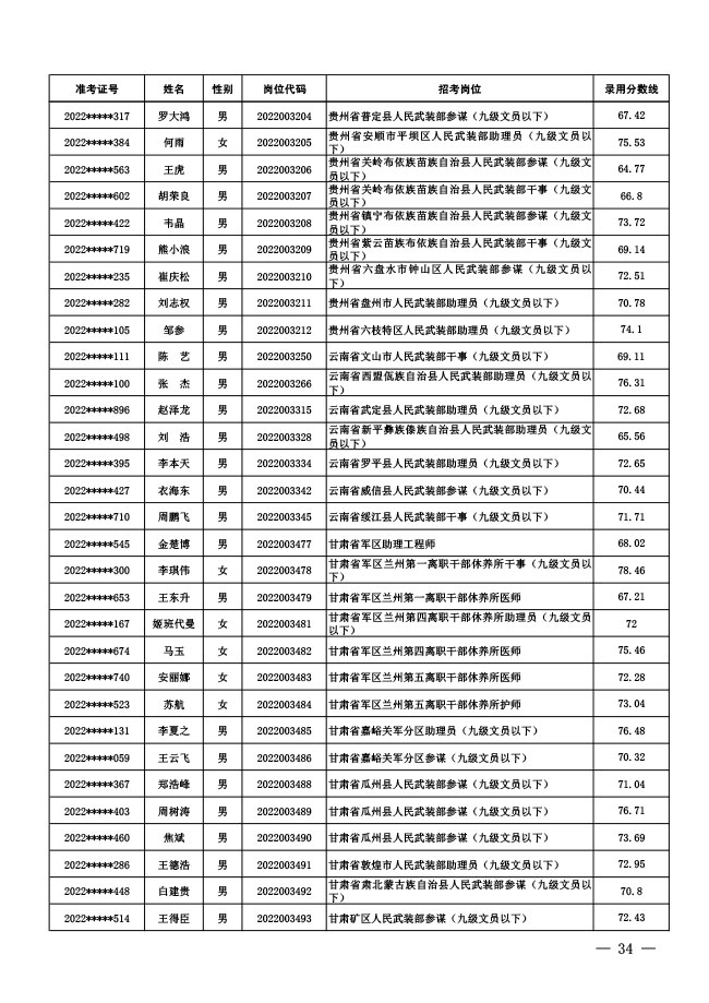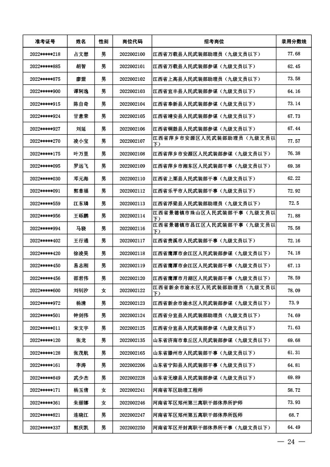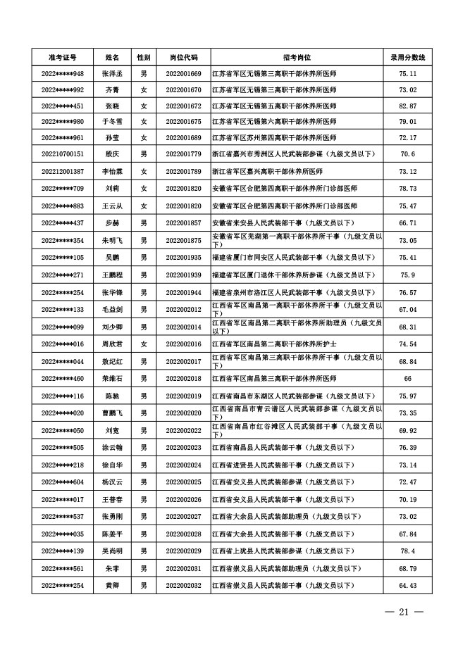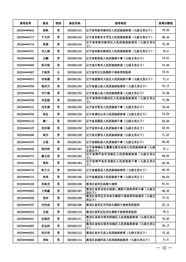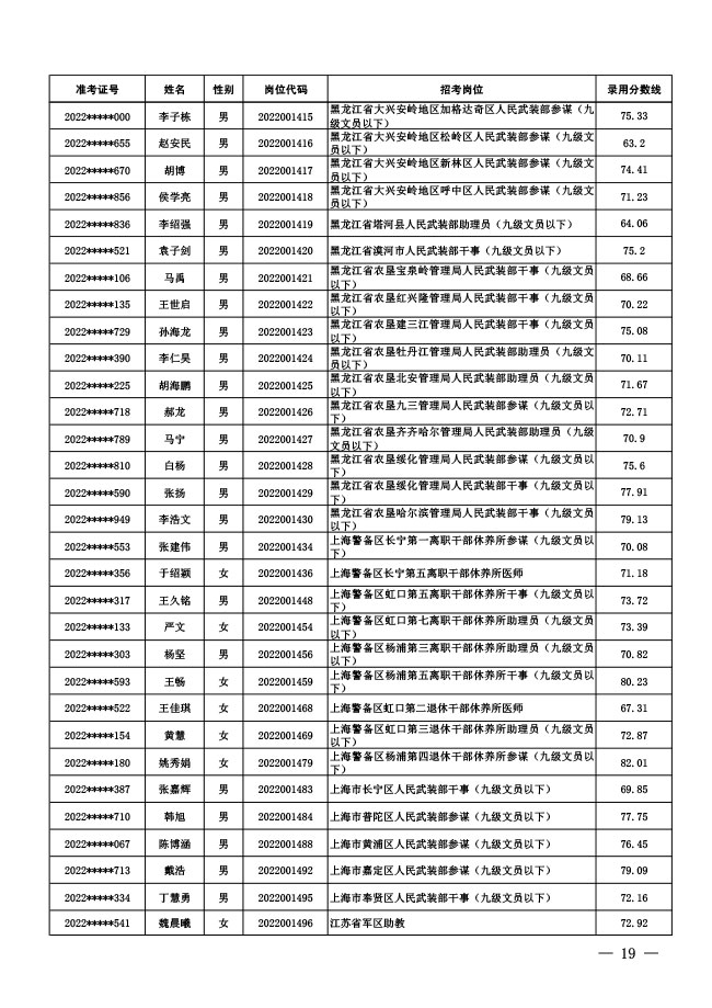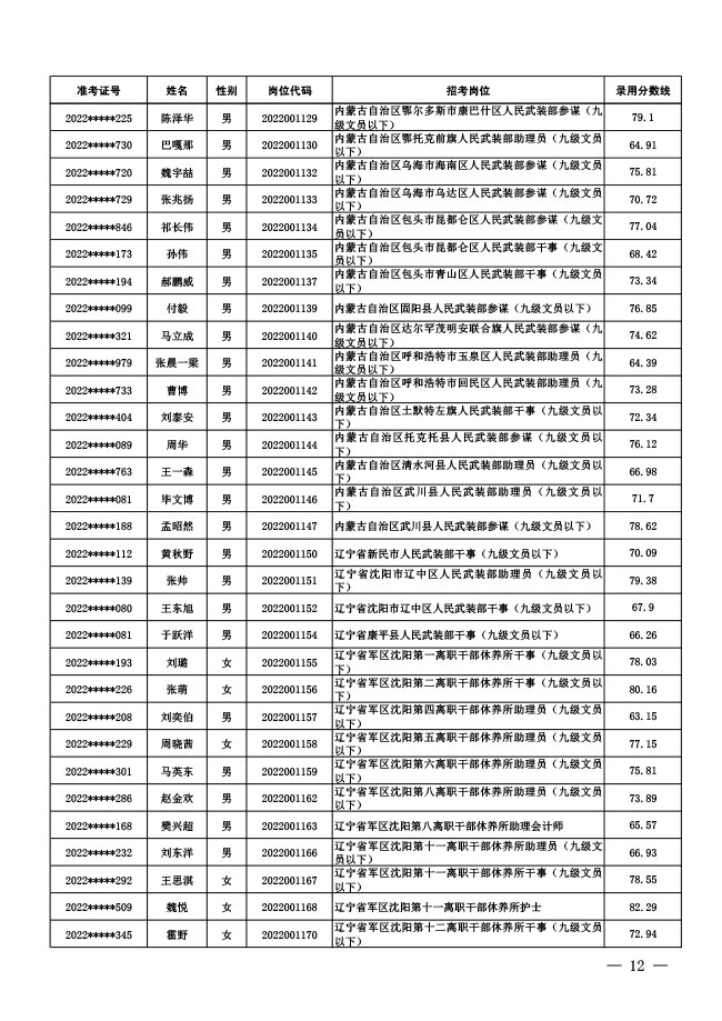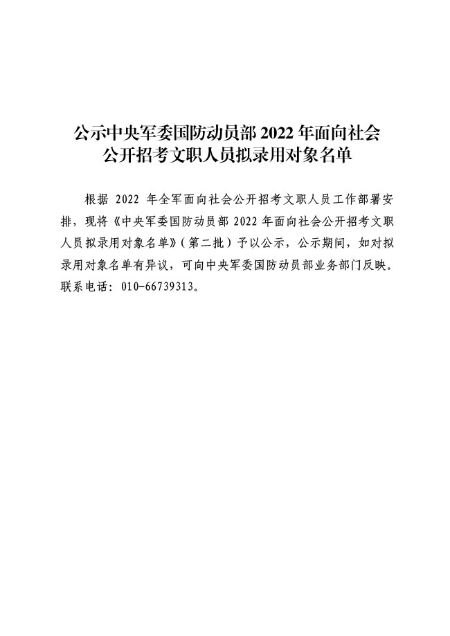 公示中央军委国防动员部2022年面向社会 公开招考文职人员拟录用对象名单