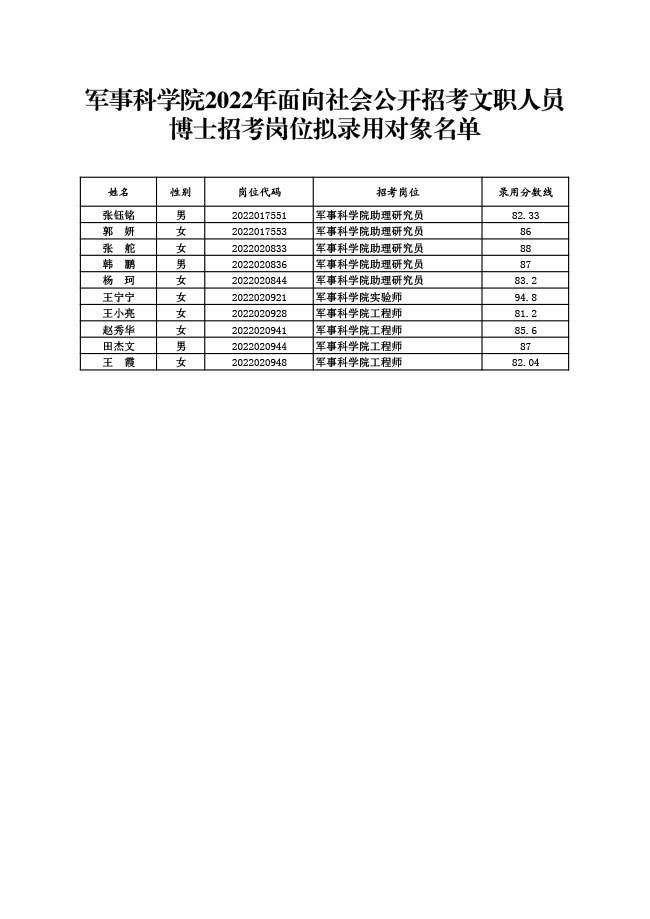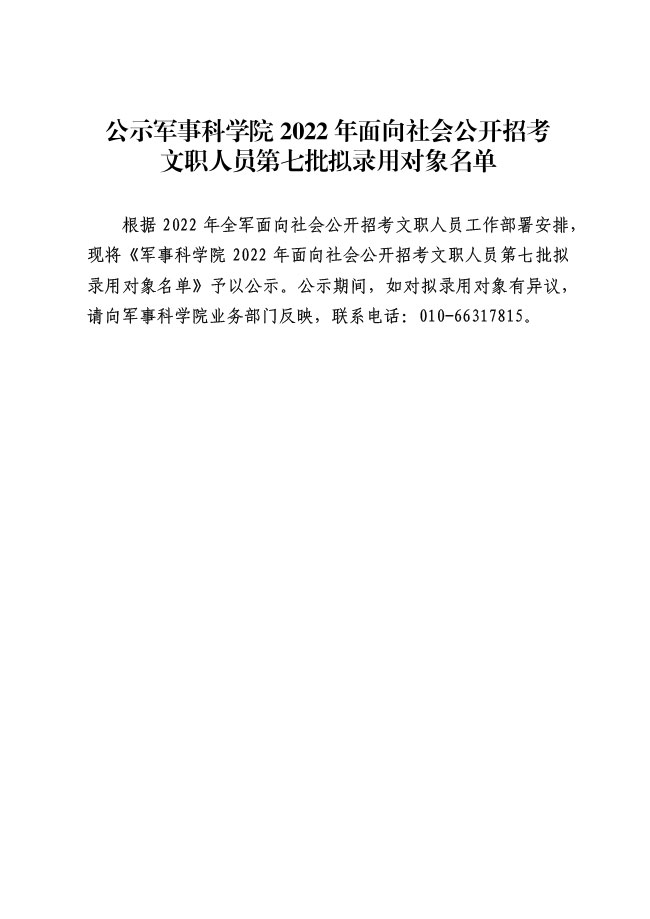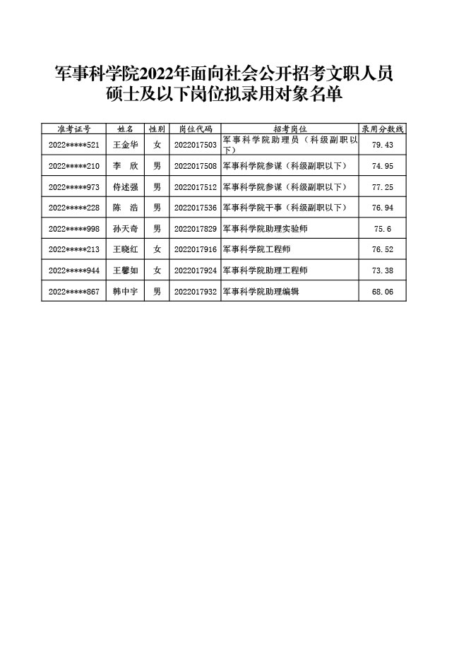 公示军事科学院2022年面向社会公开招考 文职人员第七批拟录用对象名单