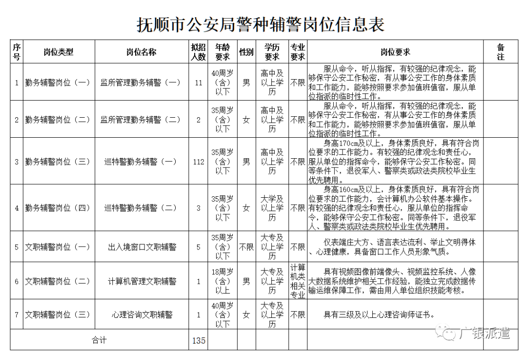 为加强社会治安防控体系建设,经有关部门批准,抚顺市公安局拟向社会公开招聘辅警135名,用工形式为劳务派遣制,不具有人民警察身份,具体招聘事宜如下: