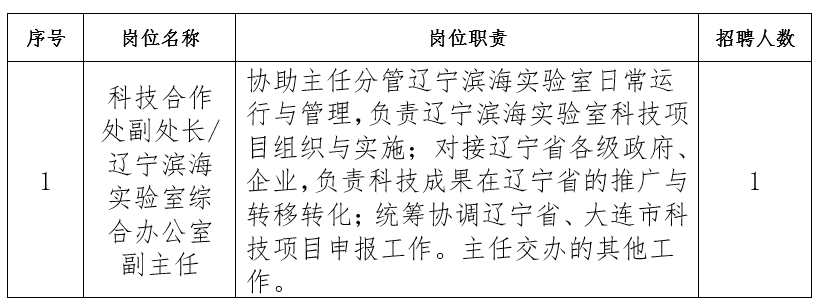 中国科学院大连化学物理研究所本着“按需设岗、公开招聘、竞争上岗、择优聘用”的原则,按照相关规定要求,面向社会招聘职能部门中层干部1名,具体信息如下: