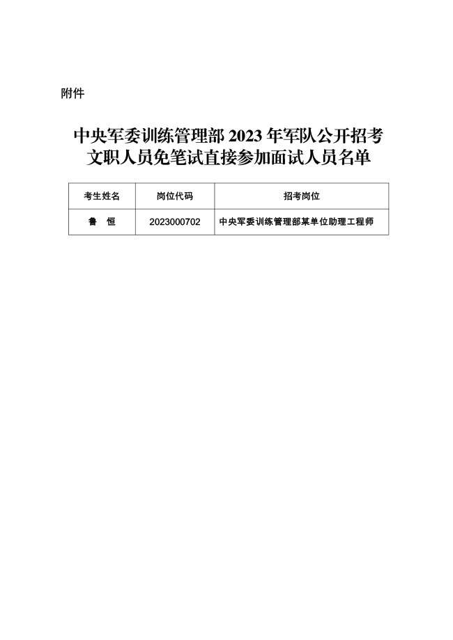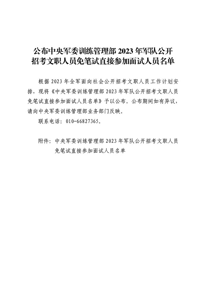公布中央军委训练管理部2023年军队公开 招考文职人员免笔试直接参加面试人员名单