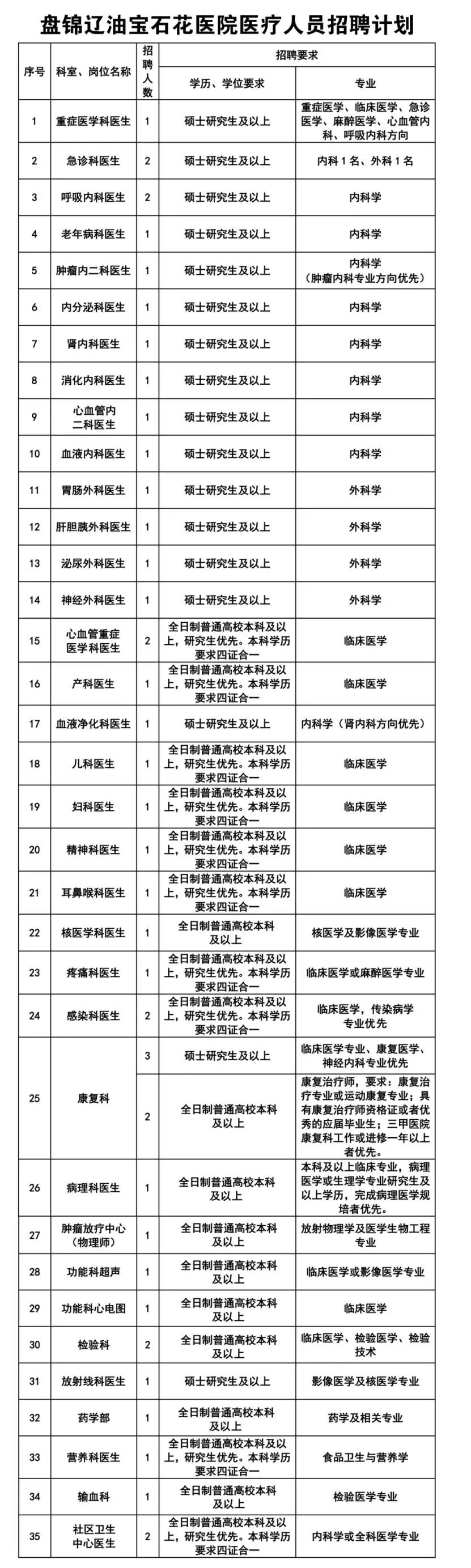 现有辽宁省重点专科1个,省级(市域)重点专科2个,盘锦市临床重点专科8个,国家药物临床试验基地9个,盘锦市医学质控中心3个。肿瘤中心、心脏中心、消化病中心、康复中心、肾病中心、眼科中心、检验中心、影像中心、健康管理中心、国医堂等10个中心建设已形成区域品牌优势,3家社区中心被评为“辽宁省示范社区卫生服务中心”。根据医院2023年总体发展规划和学科建设需要,本着“公开、平等、竞争、择优”的原则,面向社会公开招聘,招聘公告如下: