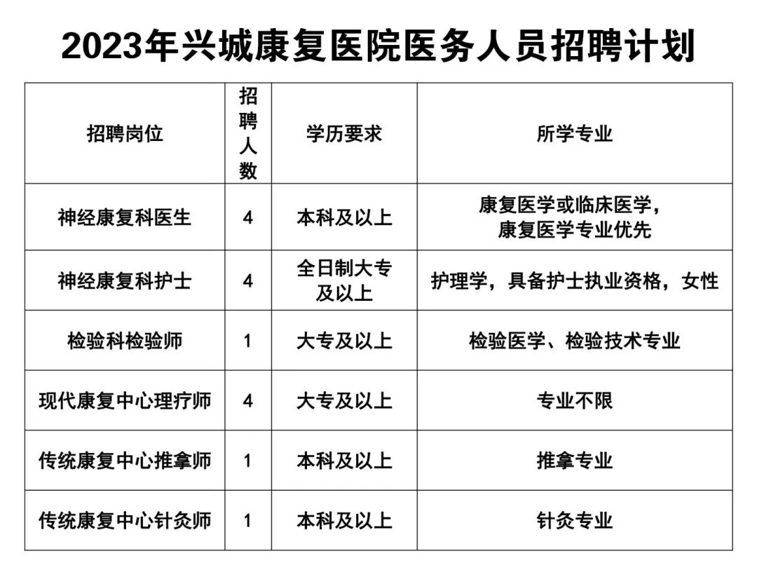 (三)兴城康复医院招聘医务人员15人,具体分配名额及要求见附表2。
