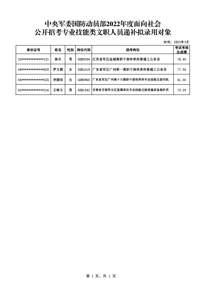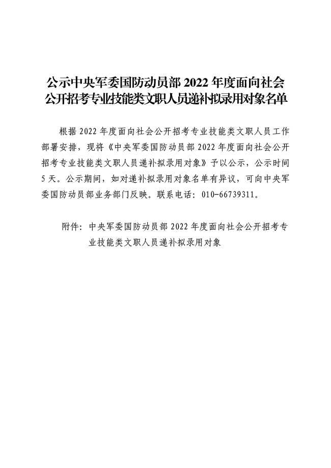 公示中央军委国防动员部2022年度面向社会 公开招考专业技能类文职人员递补拟录用对象名单
