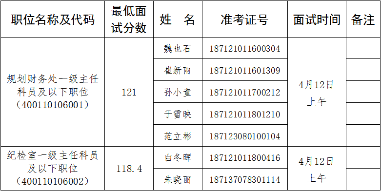 2.规划财务处一级主任科员及以下职位(代码400110106001)进入面试考生姜明珠(准考证号187123130100128)因个人原因放弃面试资格。