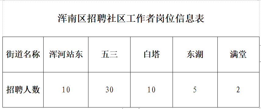 根据《沈阳市民政局沈阳市财政局关于做好2023年社区工作者招录工作的通知》精神,结合浑南区实际工作需求,经区政府决定,现面向社会公开招聘浑南区社区工作者57人。具体要求如下: