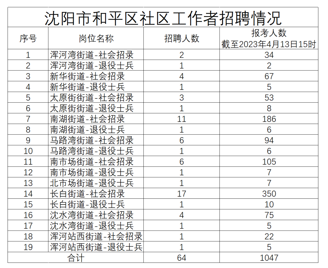 根据《2023年和平区公开招录社区工作者公告》要求,现面向社会公布各岗位报名累计人数,该数据仅供参考不作为最终资格初审通过人数。其他渠道转载请注明转自辽宁教育人才培训网公众号。各岗位报名累计人数情况如下: