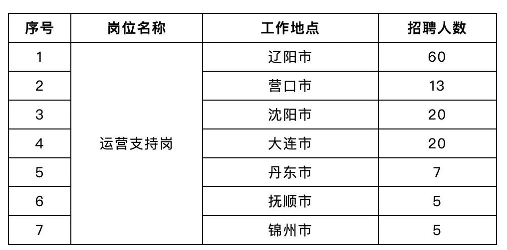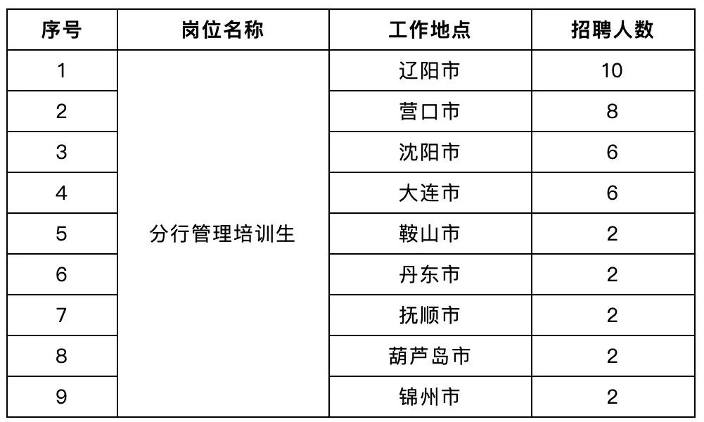 4.本次校园招聘岗位工作地点包括总、分行各机构所在地市(沈阳、大连、鞍山、抚顺、丹东、锦州、营口、辽阳、葫芦岛)。