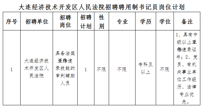 本次招聘岗位为大连经济技术开发区人民法院具有法庭速录技能的聘任制审判辅助人员岗位,共招聘1名,具体岗位报名条件见附件《大连经济技术开发区人民法院招聘聘用制审判辅助人员岗位计划表》。