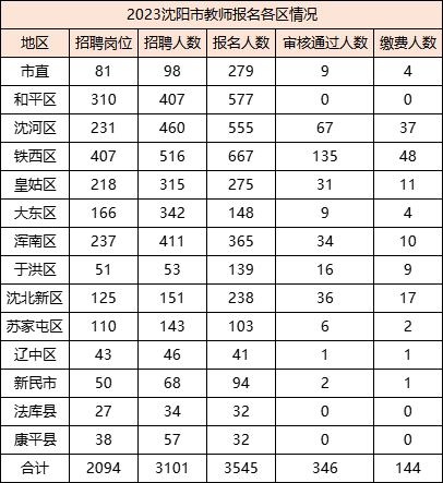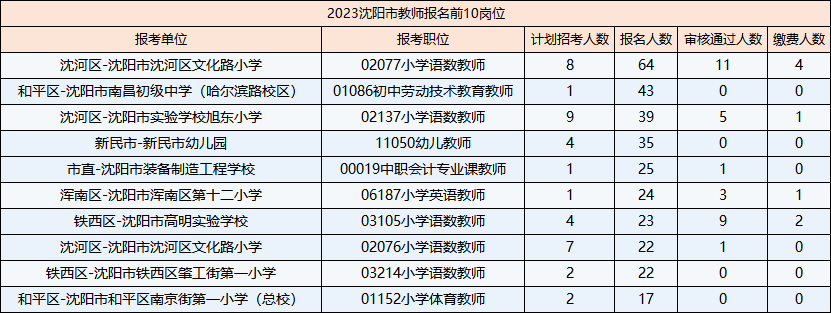 在热门报考前10岗位中,以“沈河区-沈阳市沈河区文化路小学”的“02077小学语数教师”岗位报名人数最多,报名人数为64人,审核通过人数为11人,缴费人数为4人。